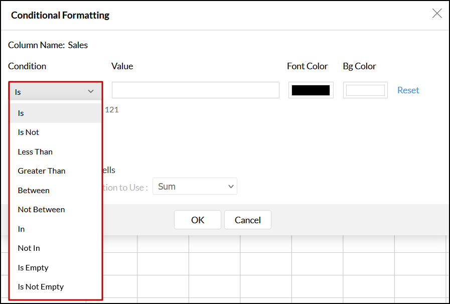 In the dialog that appears, select the required condition from the Condition drop-down. These conditions will vary based on the data type of the selected column.