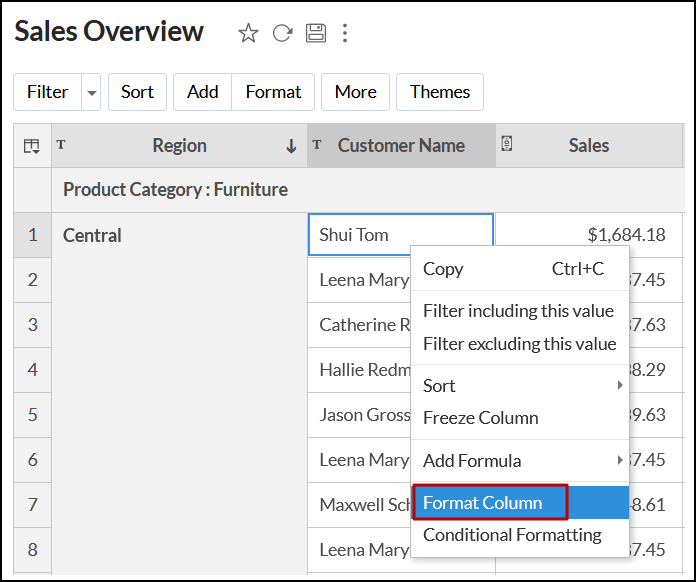 Analytics Plus offers a wide range of customization options that enable you to modify the format, sort, apply themes, and customize the tabular view as needed.