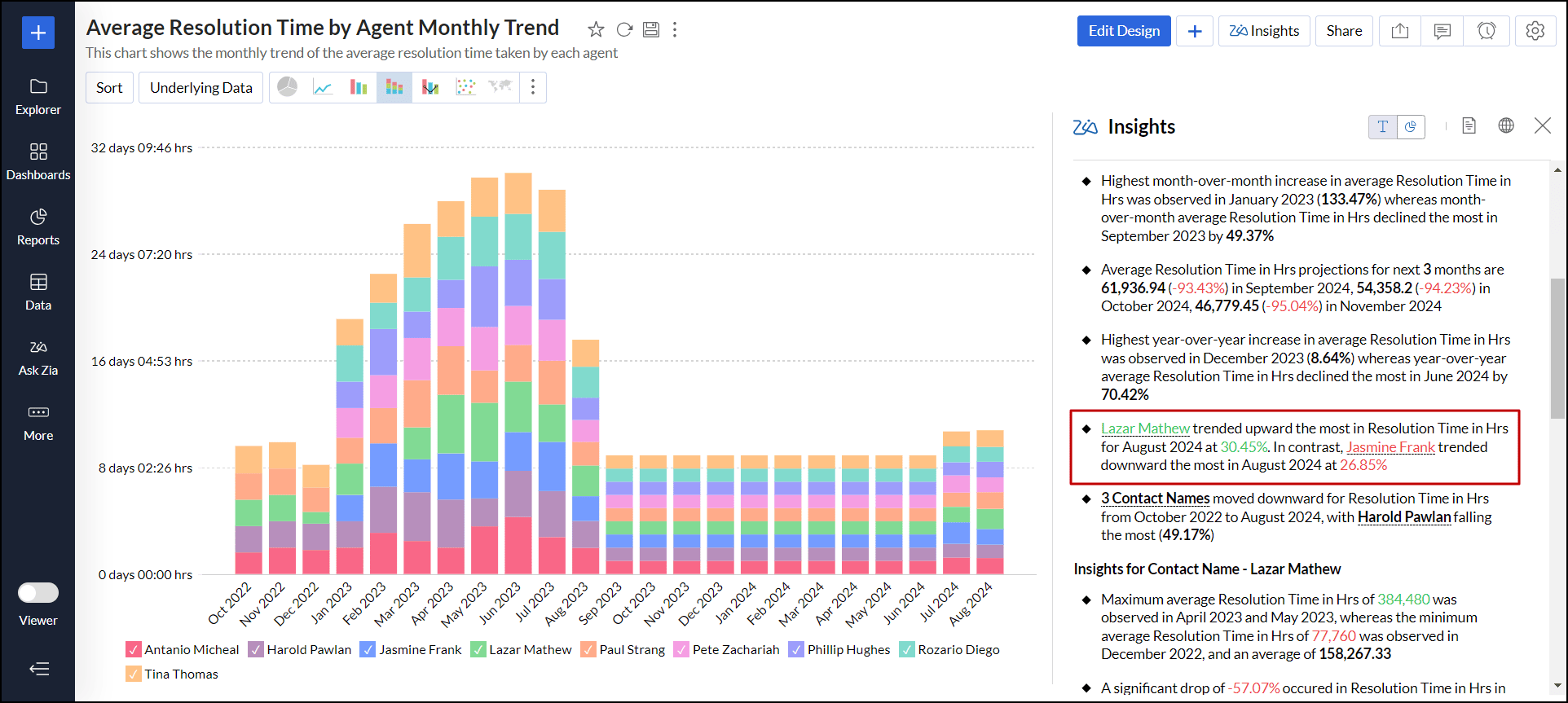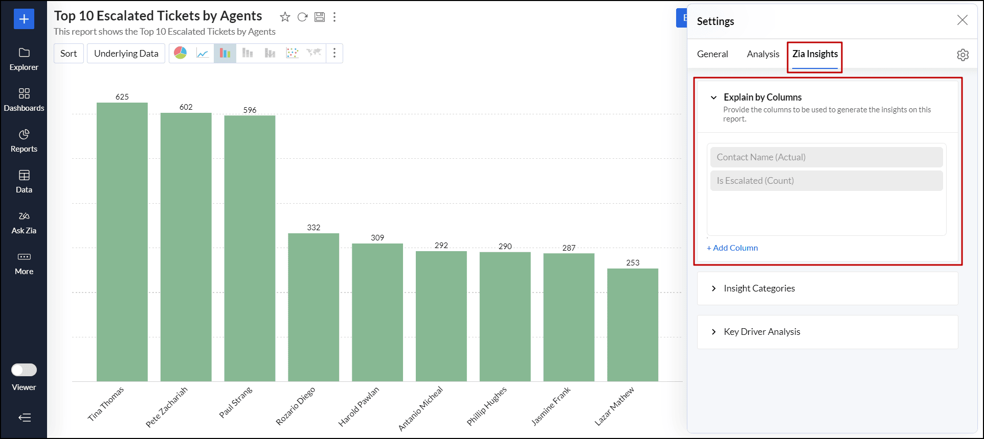 1. Open the desired report. For example, let's use the chart "Top 10 Escalated Tickets by Agents" to customize the Zia Insights. The initial Zia Insights are generated based on the Contact Name and Is Escalated tickets column.