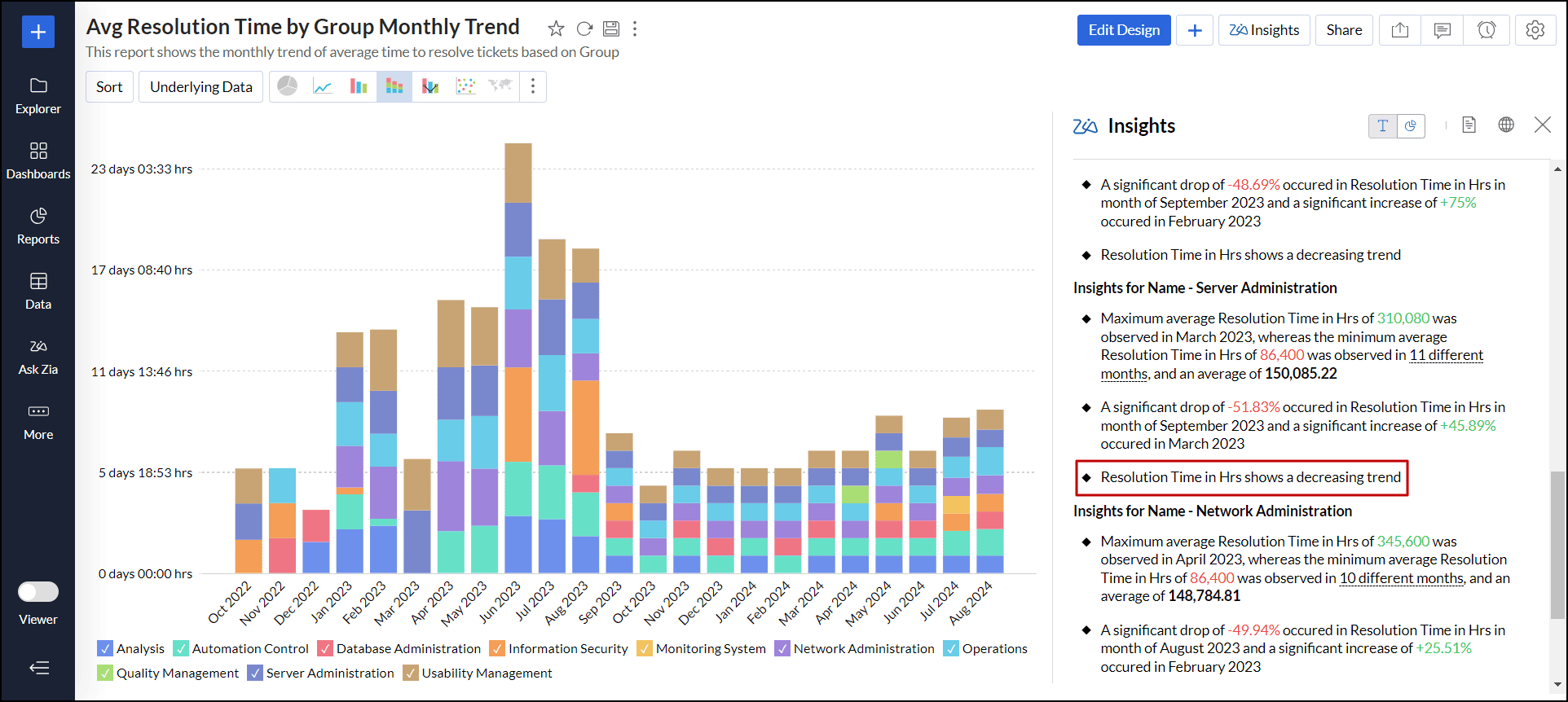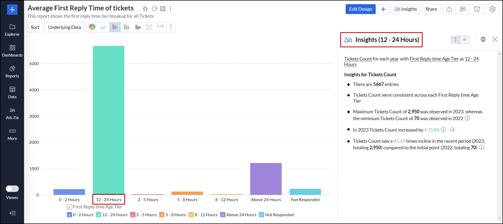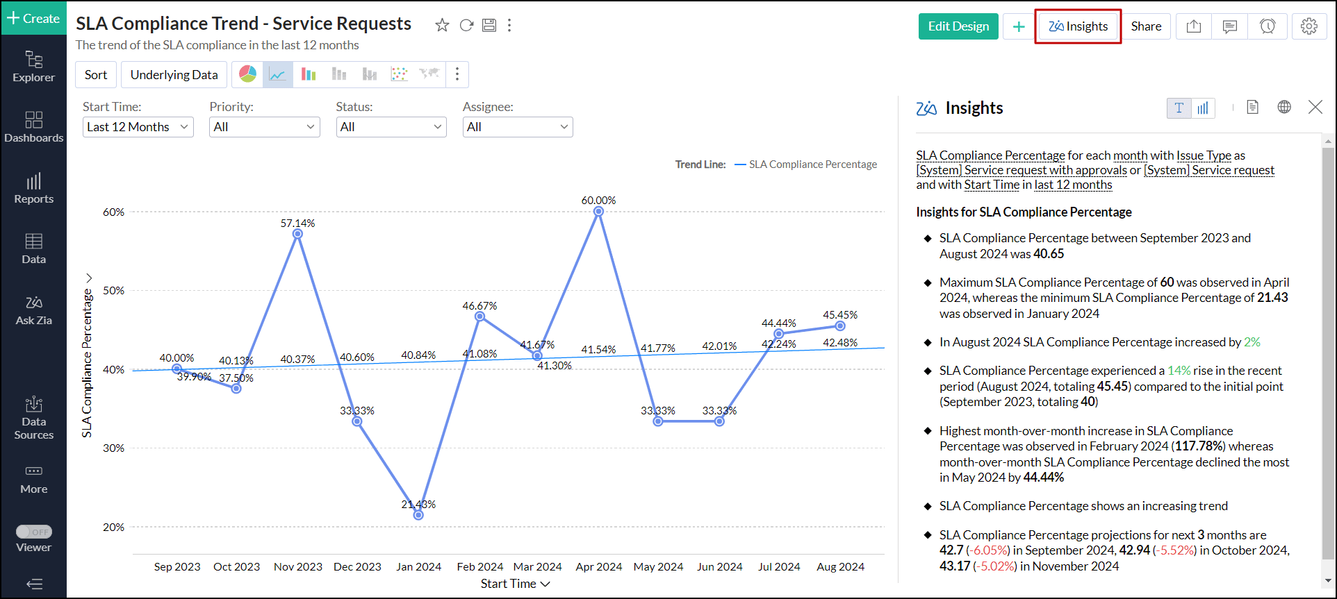 To access immediate insights on a report, open the required report and click the Zia Insights button on the top right corner. A popup appears displaying the required information.