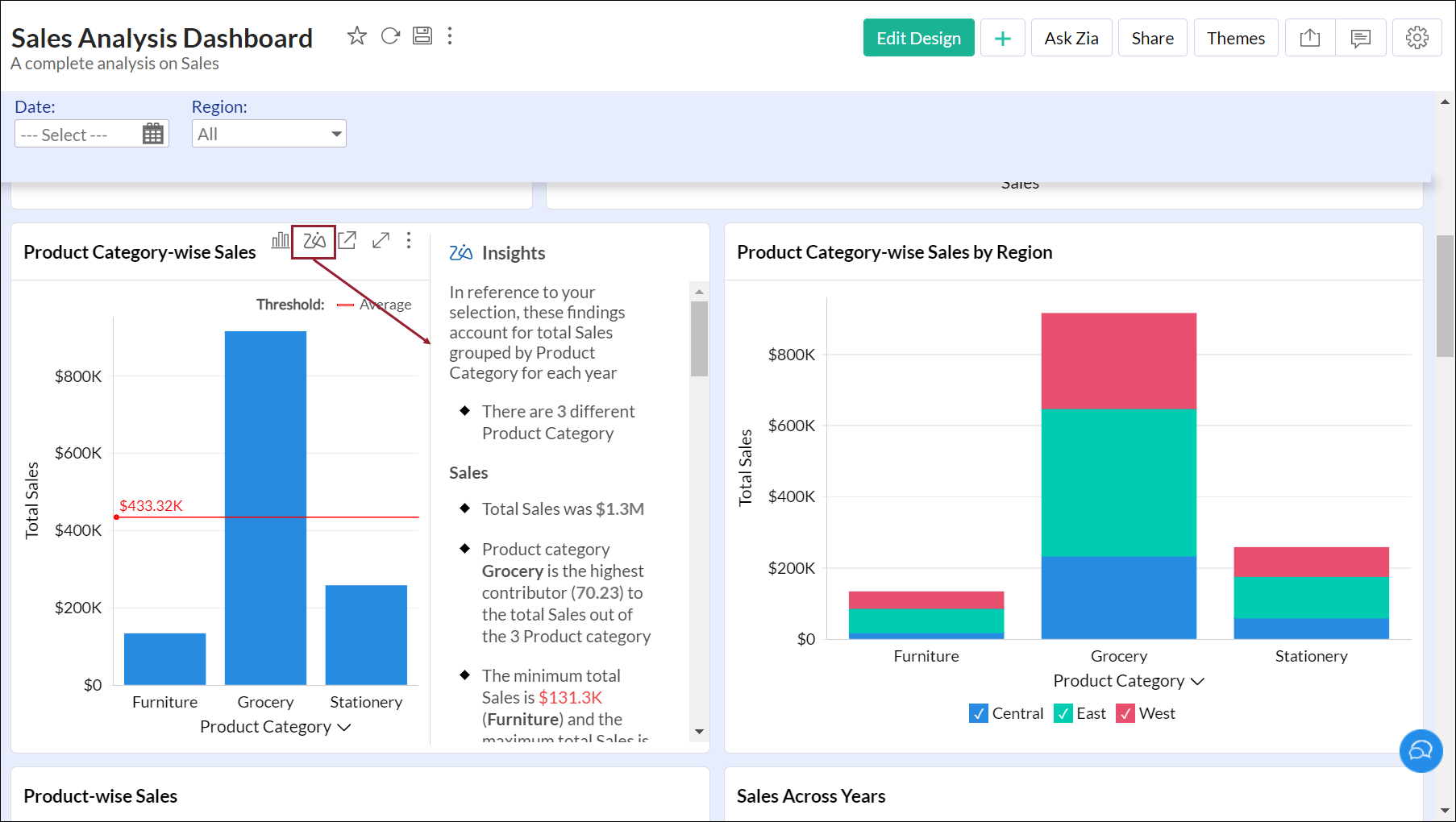 To access insights on a report embedded in a dashboard, open the dashboard, expand the required report, and click the Zia icon on the top right corner. A popup appears, displaying the detailed insights on the selected report.