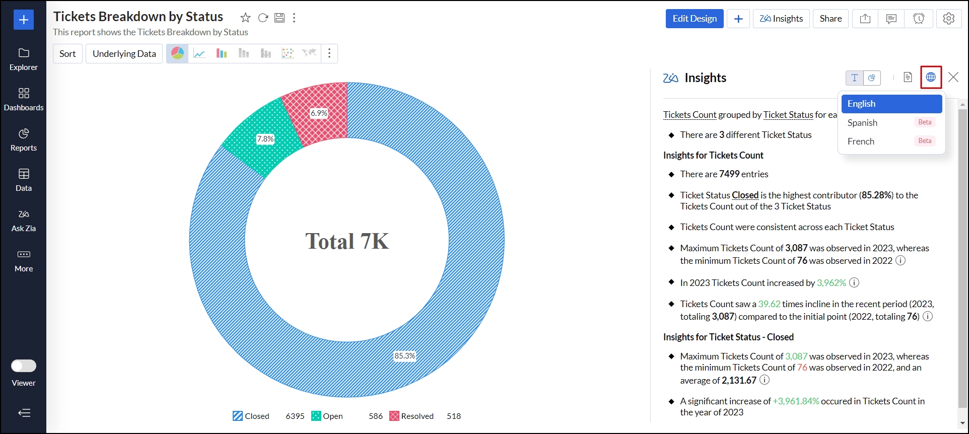Zia Insights supports English, Spanish, and French languages. The language specified in your Analytics Plus account will be the default language for Zia Insights. However, you can change this using the Language Settings option in the Zia Insights dialog.