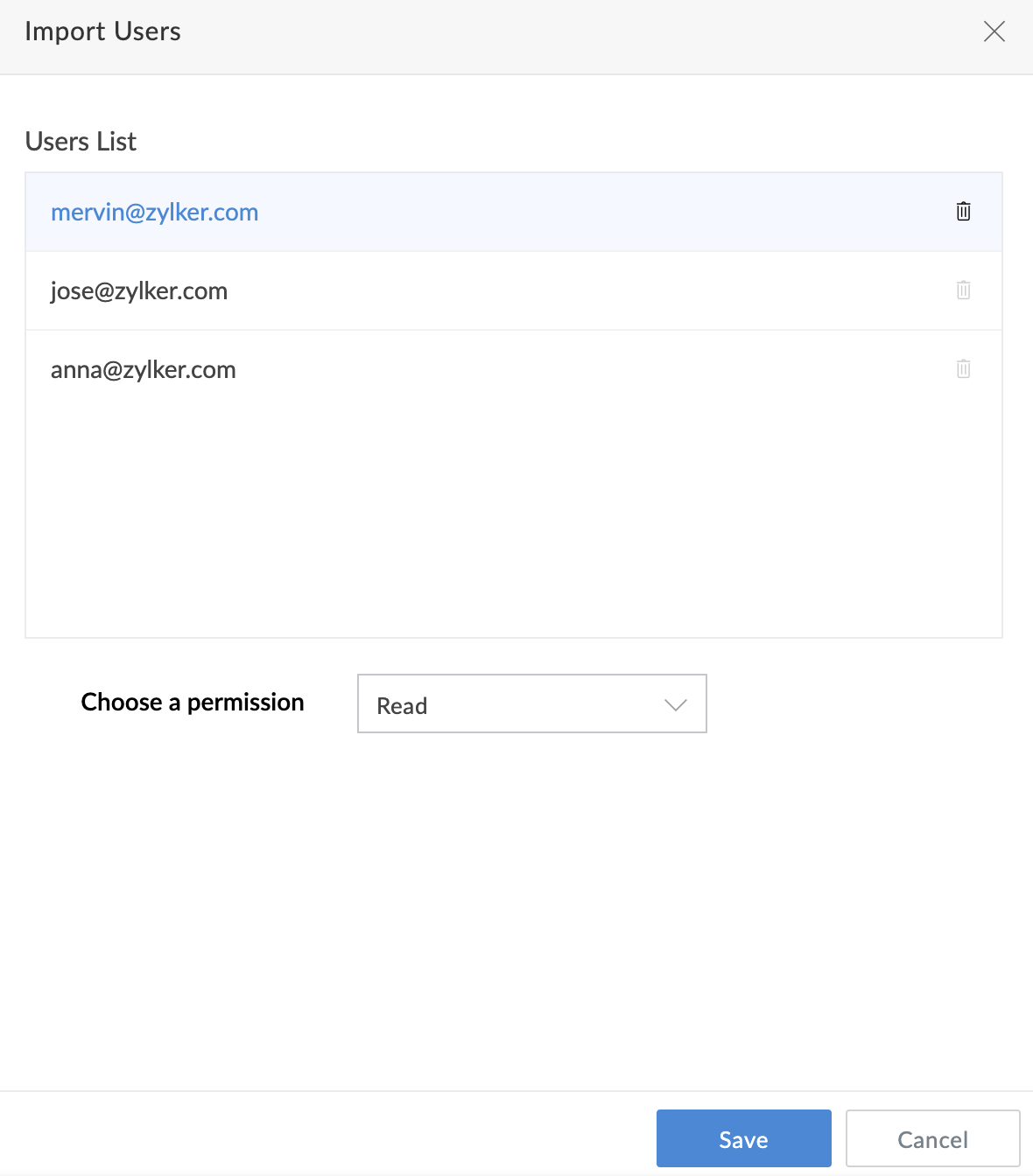 - Choose the type of the permission and click Save. You can also delete users from here.