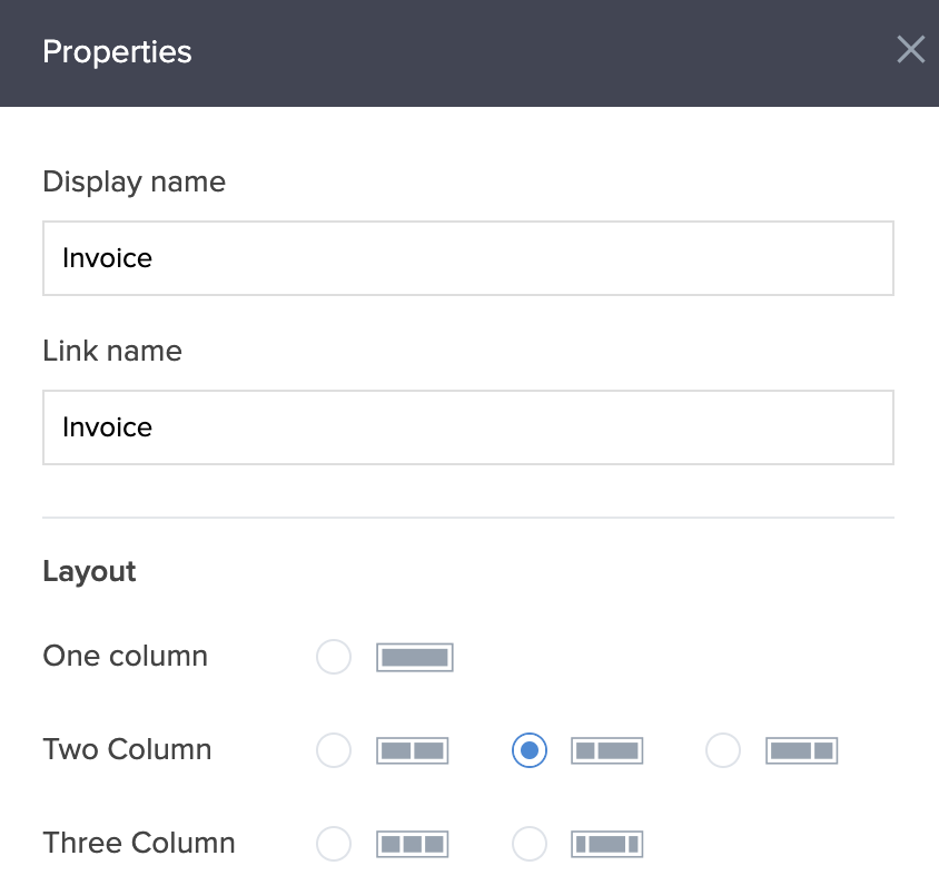 2. Select the required layout from the Properties pane. The one column layout will be selected by default.