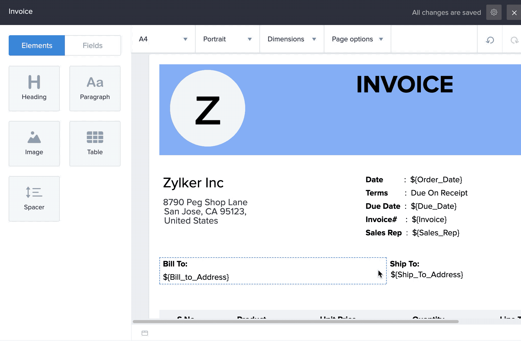 • Set Size: The template's size, such as A3, A4, applies when your users print a record and export it as a PDF. You can also set a custom width that doesn't exceed 2000 px. The height will dynamically be set based on the data present in the record when a user prints or exports it as a PDF.