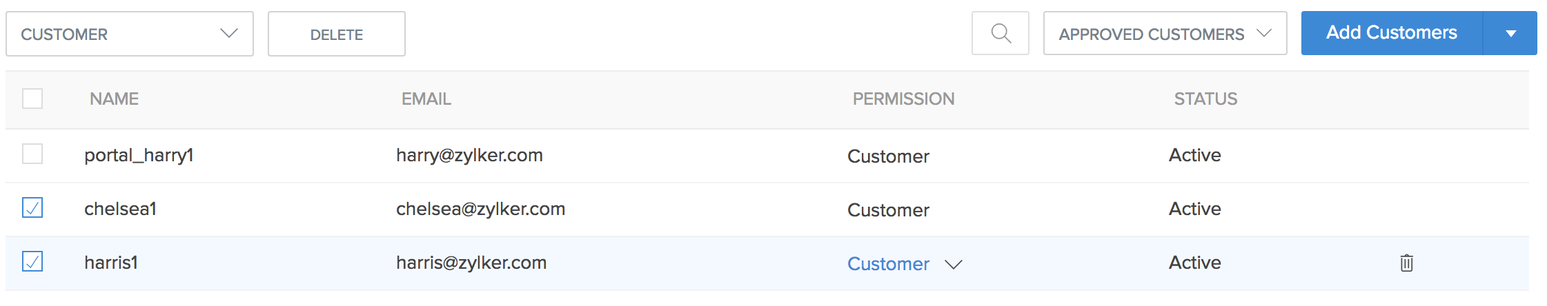 - To delete more than one customer, select the required customers. Then click the Delete button above the customers list.