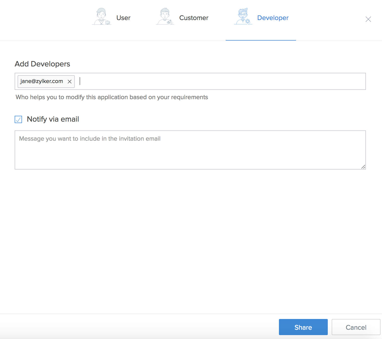 - The Share application tab will appear. This tab contains three different sections : Users, Customers , and Developers. Developers are the induviduals who help you modify the application based on your requirements. To share the application with the developer select the Developers option.