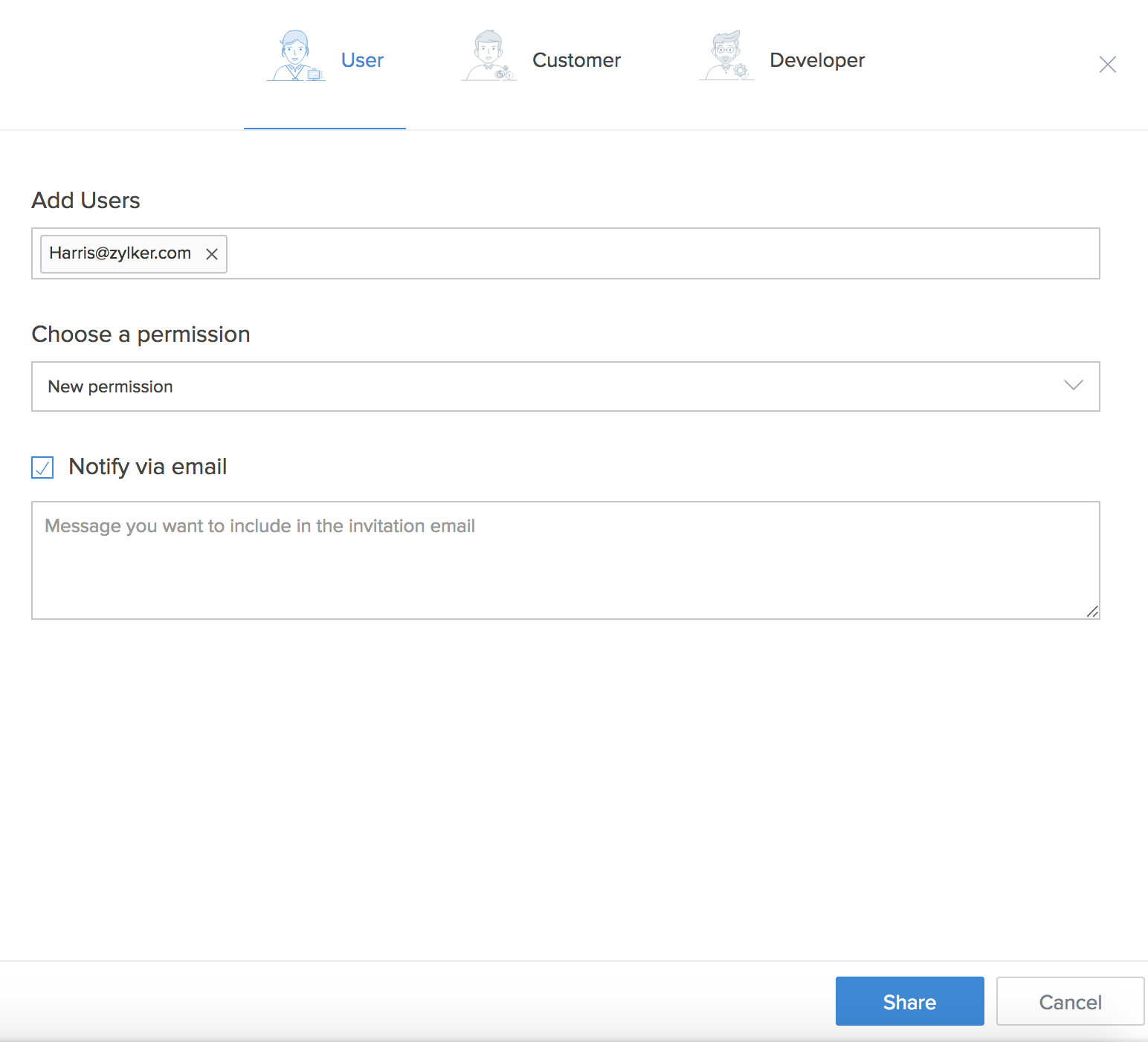 - Under the choose a permission section, the user can be assigned permissions based on the type of access you wish to grant. The permissions can be Read , Write , and Custom permission.