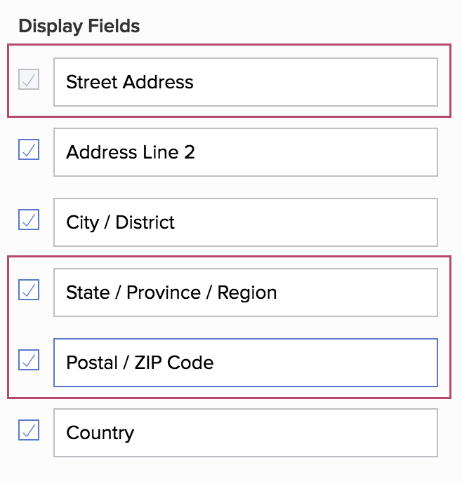 - Check the fields that you wish to display on your form. You can enable or disable all sub-fields except Address Line 1, which has a disabled checkbox next to it: