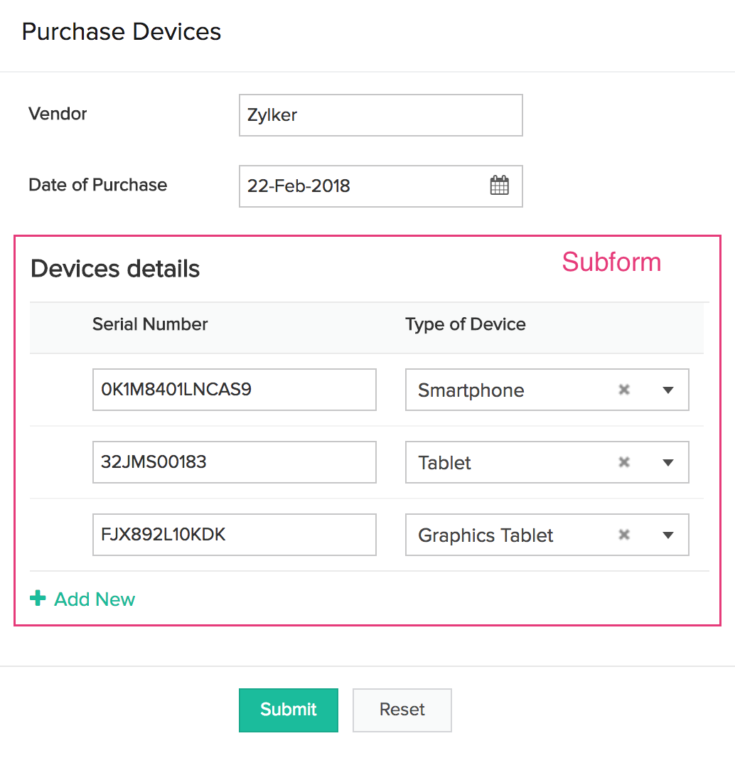 When you add a subform field in your form, such that it enables entering the details of devices being purchased, the following will be the benefits:
