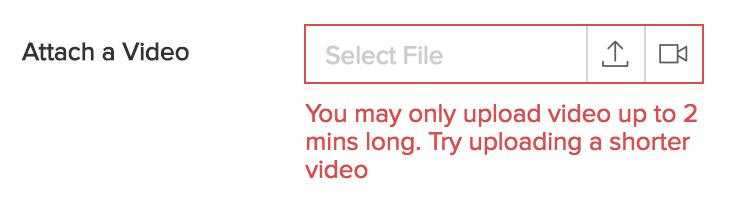If your user uploads a video that's longer than the allowed duration that's set for that video field, ManageEngine AppCreator will alert as follows. The following image shows a video field that's set to accept a video of up to 2 minutes.