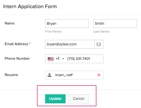 The Update button is displayed in place of the Submit button. Clicking/tapping the Update button does the following:
