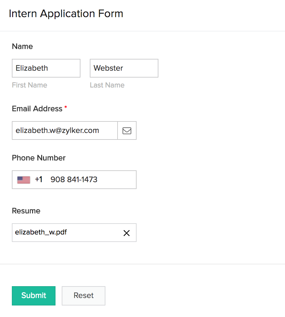 • Field names are displayed inside their input boxes as tooltips (see the Resume field), and then move above the field when users input data.