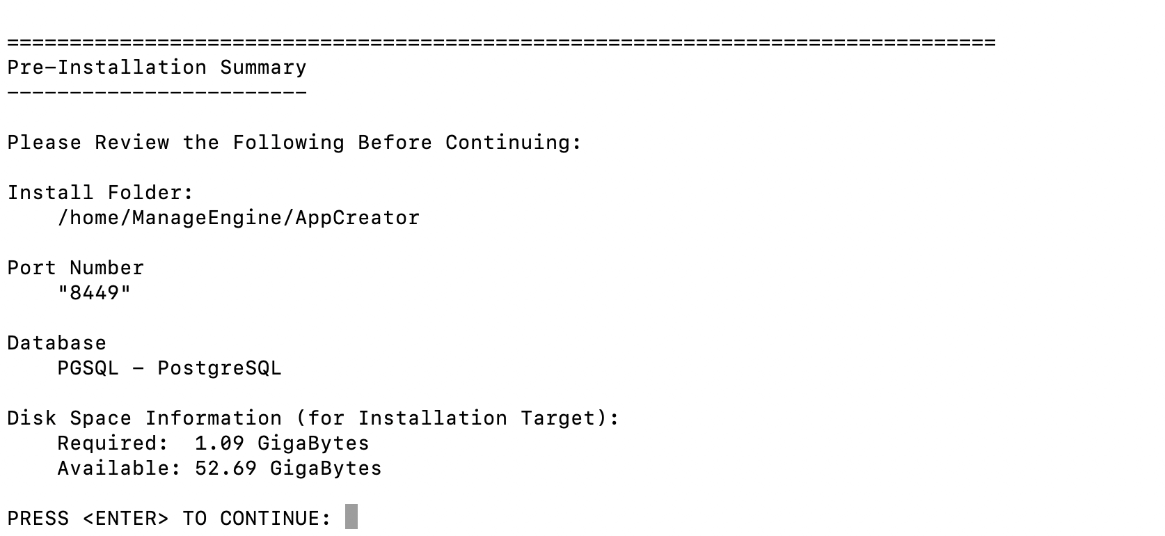 - Execute the installation file using the following command:./ManageEngine_AppCreator.bin -i console