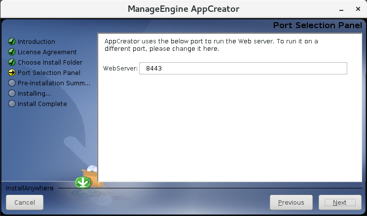 - Update the installation file's permission using the following command:chmod a+x ManageEngine_AppCreator.bin