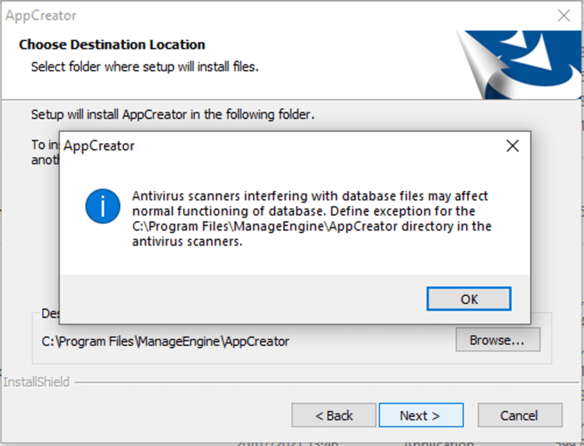- You'll be prompted to define exceptions for the ManageEngine AppCreator directory from the antivirus scanners.