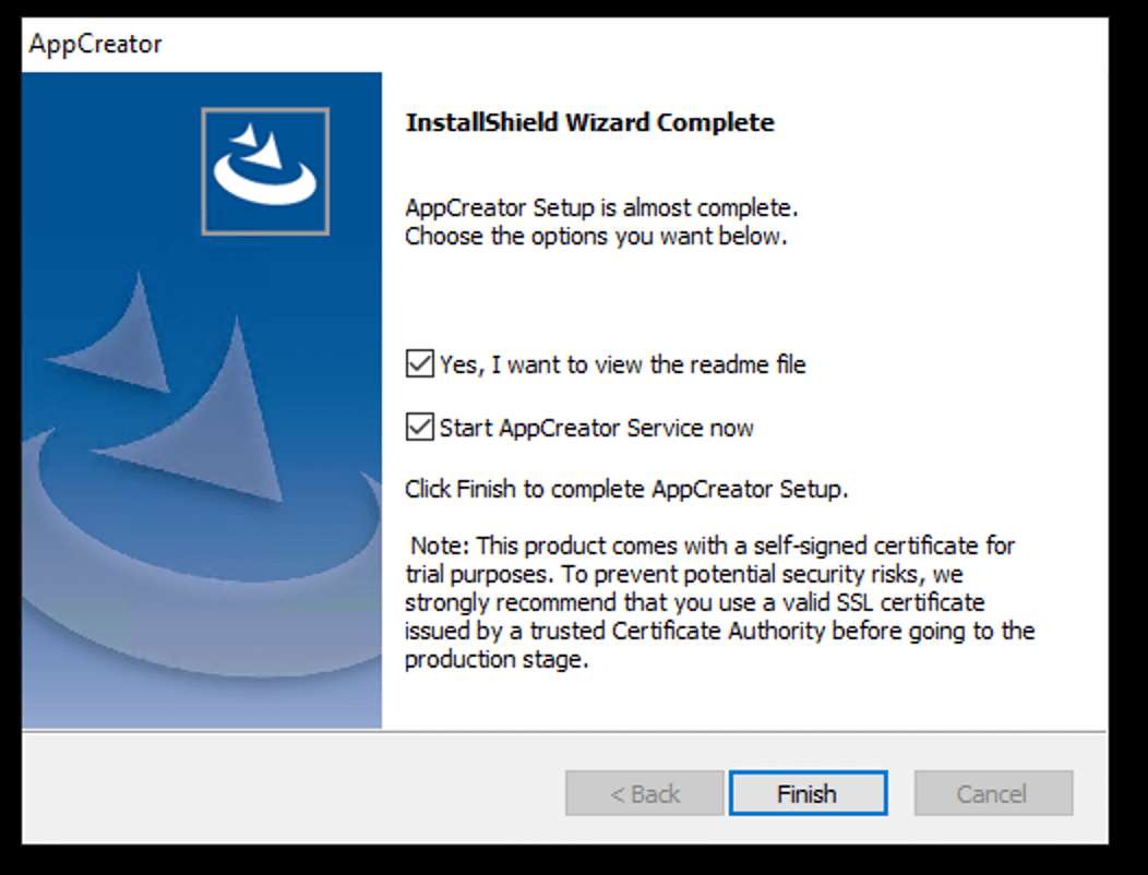 - Upon successful installation, you'll see the host where you can access ManageEngine AppCreator. Also, you'll see prompts to start the server and to view the readme file after the installation is completed.