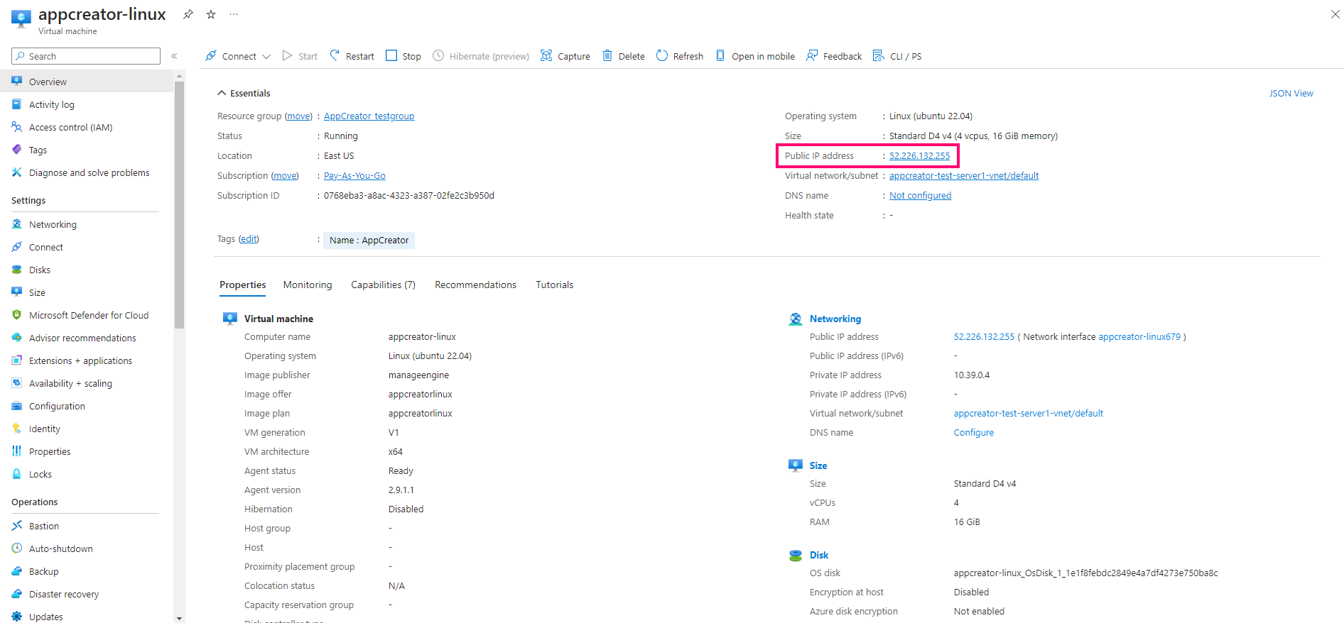 Step 14: Copy the Public IP address listed in your VM's Overview page, this can be used to access your application. You can log in to your VM and run the changeHostPort command to change the port on which AppCreator runs.
