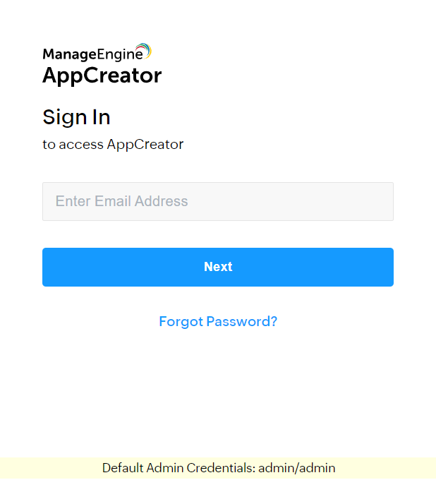 Use the following credentials in the screen that appears to login to ME AppCreator. Please change the default password upon login.