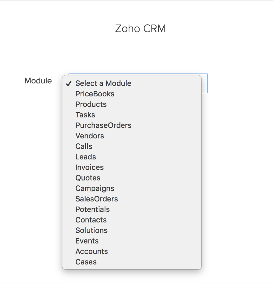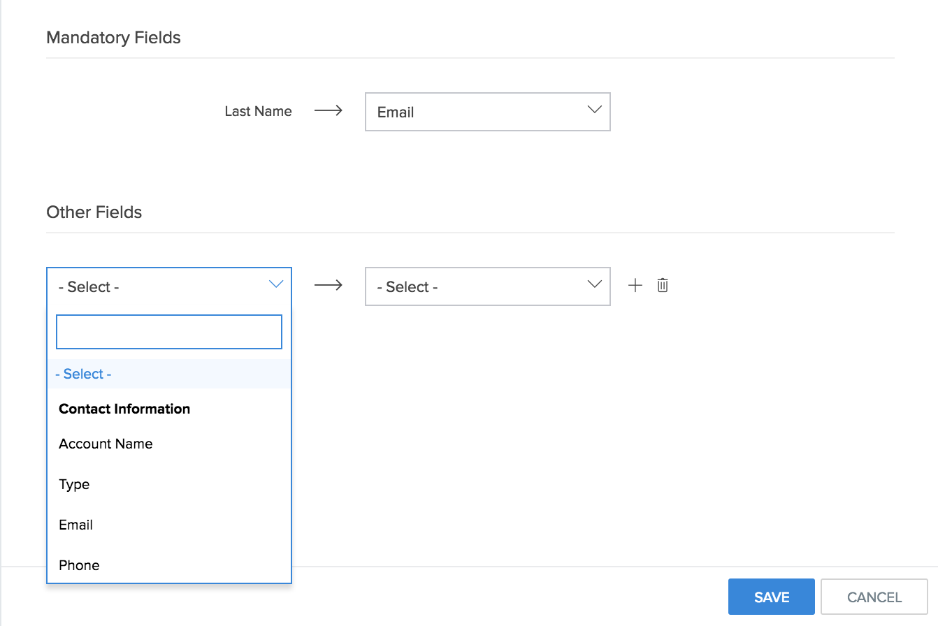 - Mandatory fields - These are the required fields in the chosen Zoho CRM module that must be mapped to a corresponding field in ManageEngine AppCreator. The drop-down lists the fields on your AppCreator form. Select the required field. Note: The mandatory fields vary based on the selected service and module.