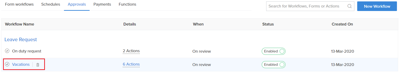 - Navigate to the Approvals tab on the Workflows page. The page will list all the preconfigured approval workflows.
