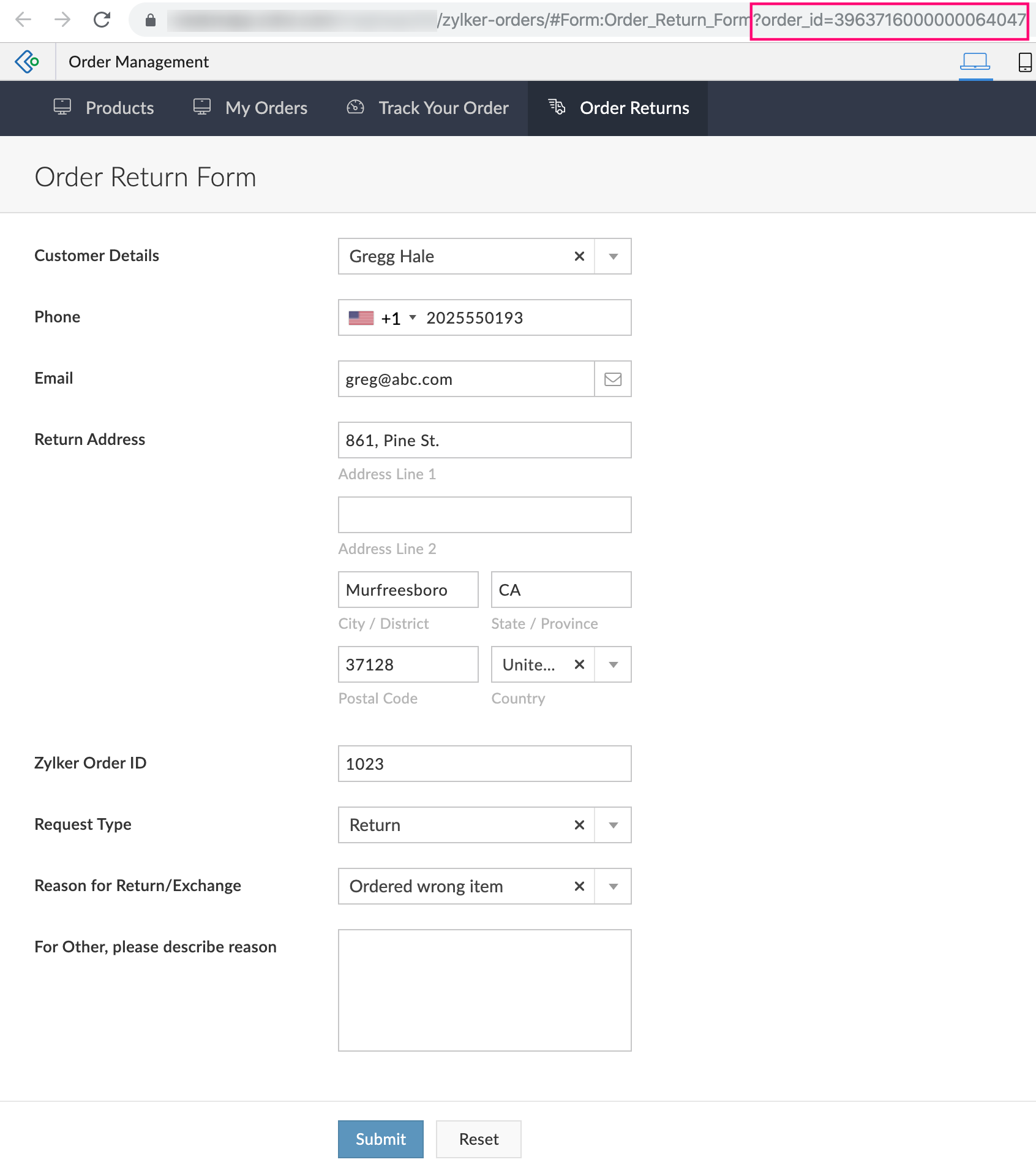 Upon clicking this button, the Order Return form opens and the Order ID field and other order details are pre-filled based on the order_id parameter. The user can choose the request type, reason for return/exchange and submit the form.