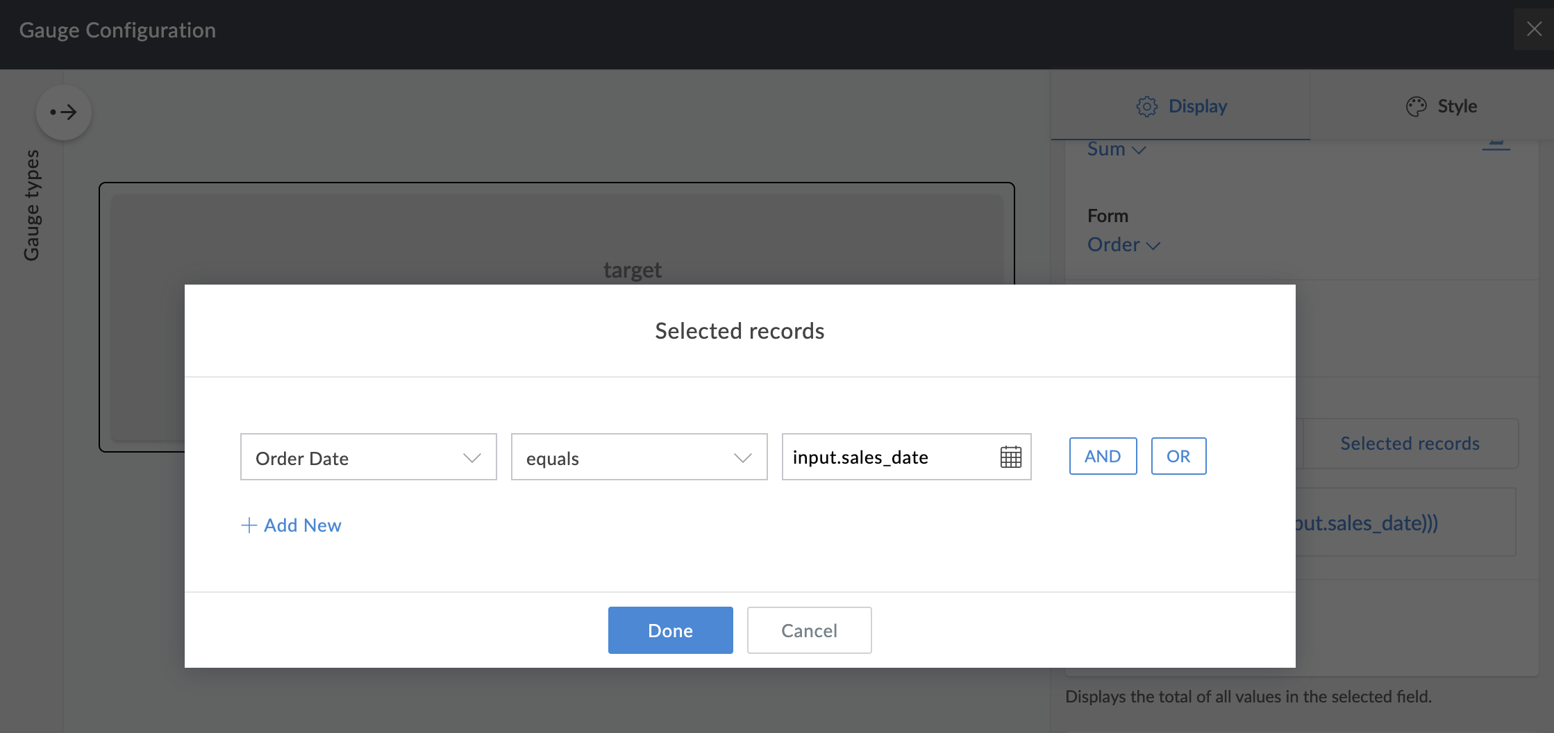 Imagine you've created an application called Order Management. In this application, you have designed a page titled Dashboard and embedded a gauge that is configured to display the sum of total amount of all orders on a particular day. Now, while setting the filter for Selected records, you can specify the parameter name in the place of value. Here, the parameter name is sales_date.
