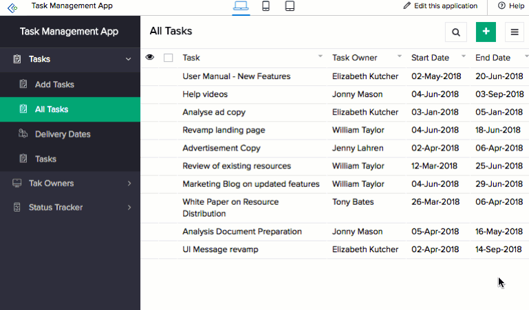 Detail view incorporates actions into each record, thereby allowing actions that could be used while viewing one particular record. For example, if you select a record in your report, the detail view of the record will appear. The actions will be visible at the top of that record. These actions are specific to the record that you are viewing. Let's assume that you are viewing the detail view of a record in a task management report. The detail view is that of a task. If you need to make a change to the end date for the task, you can edit the record using the Edit action available in it.