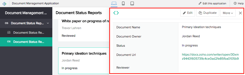 There are two views to a report: quick view and detail view. Both these views can be assigned with layouts that clearly present the data in that particular view. To have your report appear in a certain structure, you must determine the layout while building your application. The layout that you select is what reflects when you access the report. The fields and records are arranged in a manner that provides proper insights to the data collected.