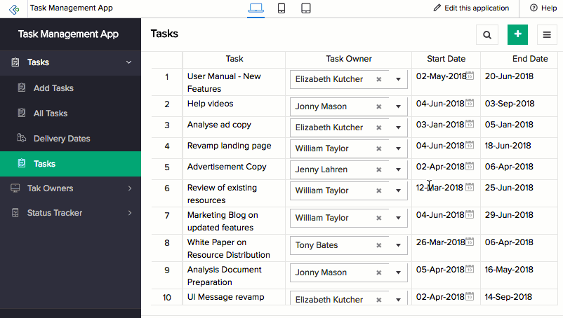 Quick view facilitates actions that are applicable to the report on the whole or a collection of records. You can perform an action to a bulk of records thereby removing many records at one shot. Let's assume that you have a Task Management application in which you have a status tracking report. If you have a record which requires a change. The Task Owner field value of a record needs to be changed. You can directly make the required change in the report field.