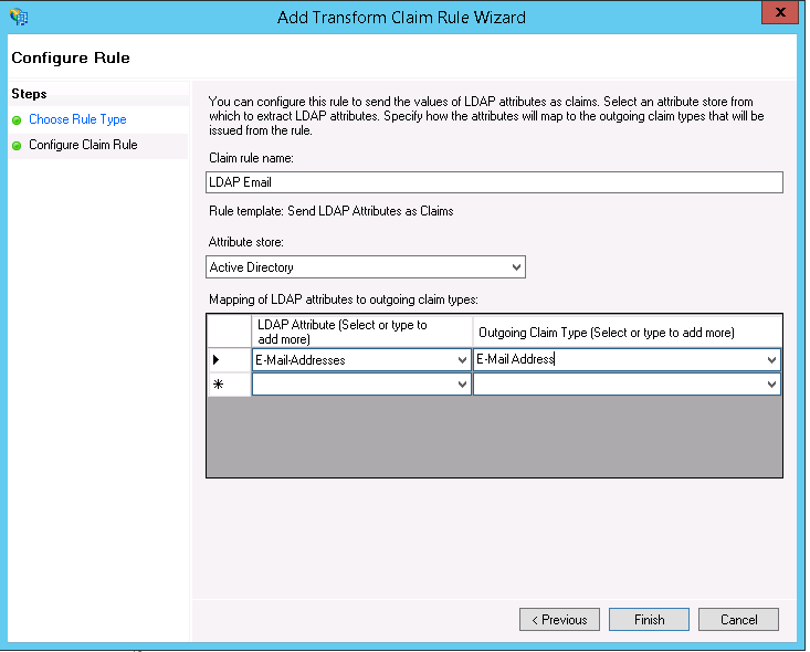 • Choose E-Mail Address as the Incoming claim type from the drop-down menu.