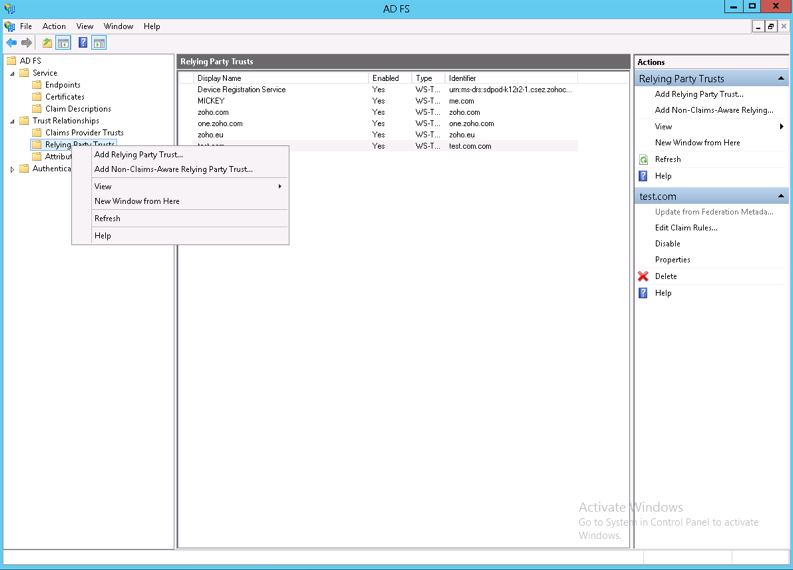 • Go to Relying Party Trust under Trust Relationships and select manageengine.com.