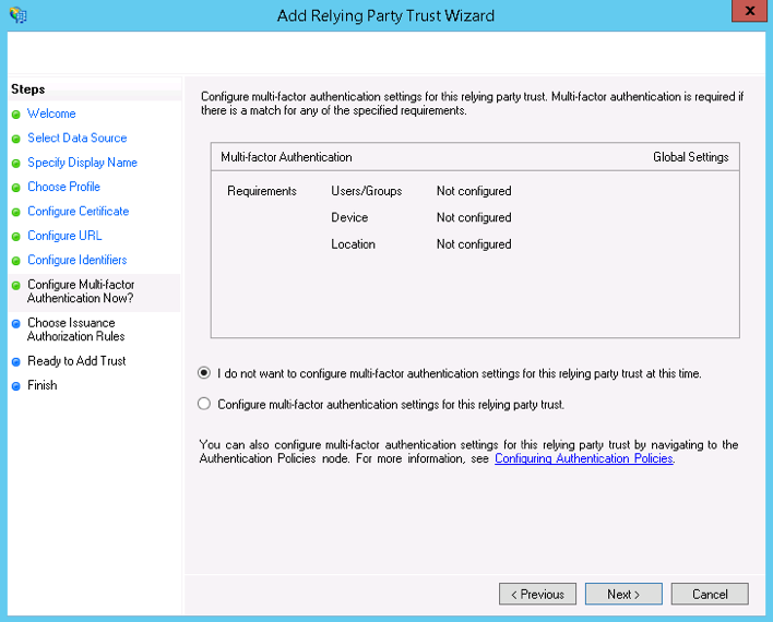8. Choose I do not want to configure multi-factor authentication settings for this relying party trust at this time on the Configure Multi-factor Authentication Now screen and click Next.