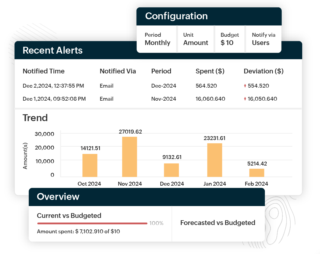 Checks in CloudSpend provide proactive budget and forecast monitoring across AWS, Azure, and GCP accounts. By setting custom spending thresholds and anomaly deviation limits, you receive real-time alerts when actual usage deviates from expectations. AI-enhanced detection filters out noise to surface only meaningful alerts, reducing fatigue. Checks also enable seamless show-back and chargeback, letting you track budgets at the account, business unit, or report level. This empowers FinOps teams to enforce budget compliance, investigate unusual spend immediately, and maintain financial control across multi-cloud environments without manual monitoring.
