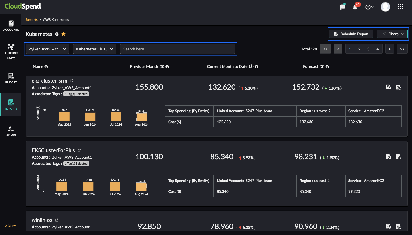 The Kubernetes cost report by CloudSpend delivers real-time cost visibility and insights in a separate unified dashboard for organizations using Kubernetes in their AWS accounts, Azure subscriptions, and GCP projects. This enables users to obtain detailed cost breakdowns by different categories to identify cost drivers. In addition, you set budgets and schedule generating Kubernetes cost reports.