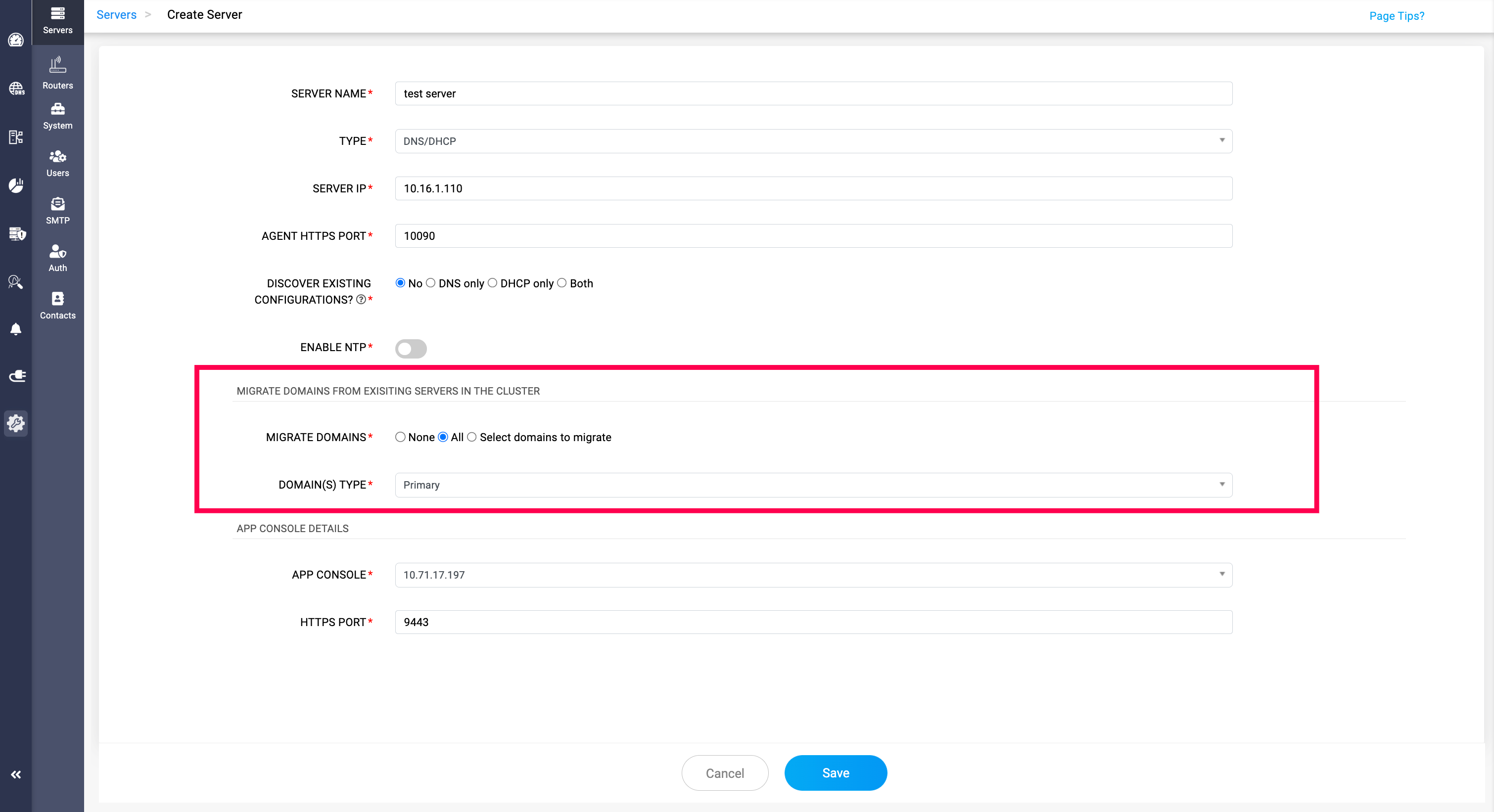 Enter the essential details of the main server running the Management UI Console. This step is mandatory, as it helps establish the connection between the to be onboarded DNS/DHCP server and the Main Console server.