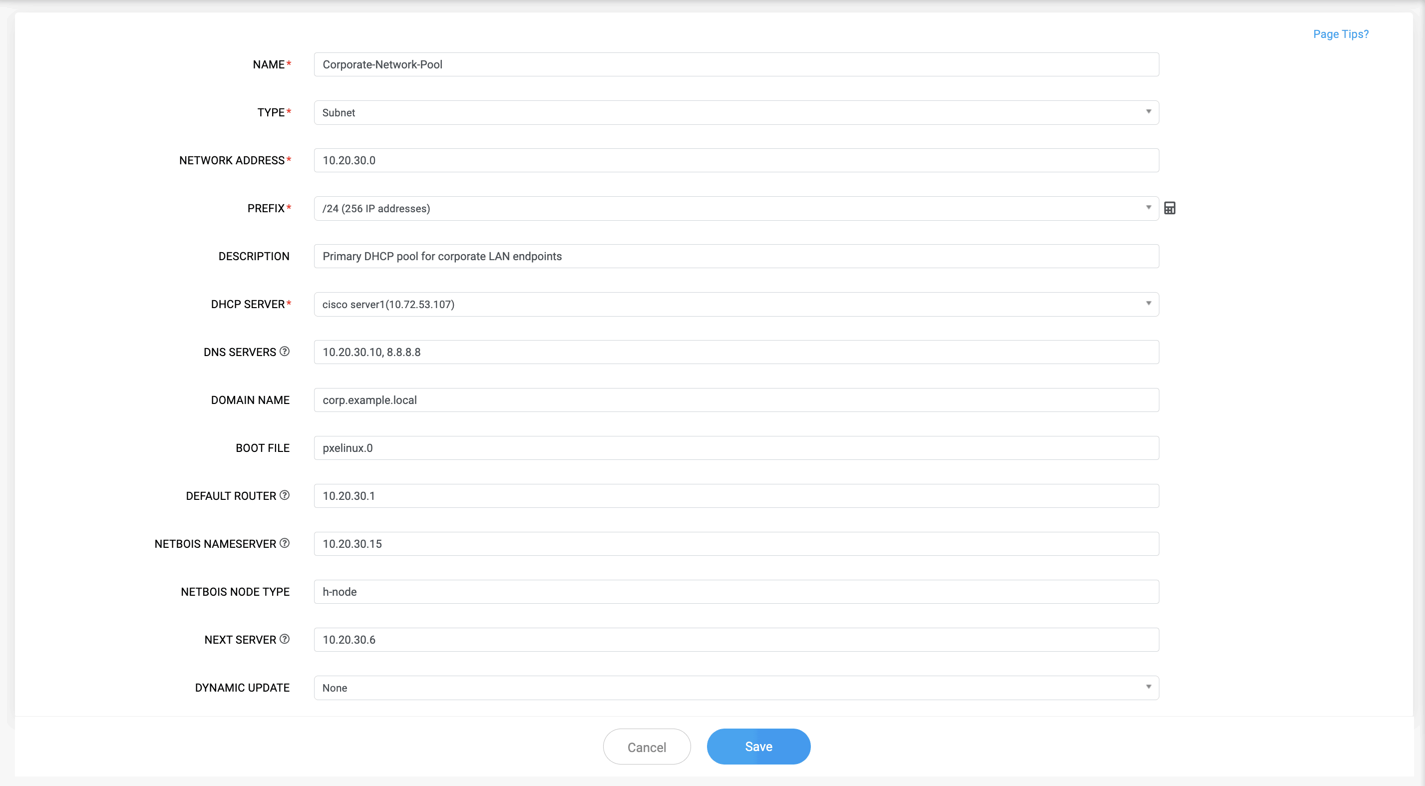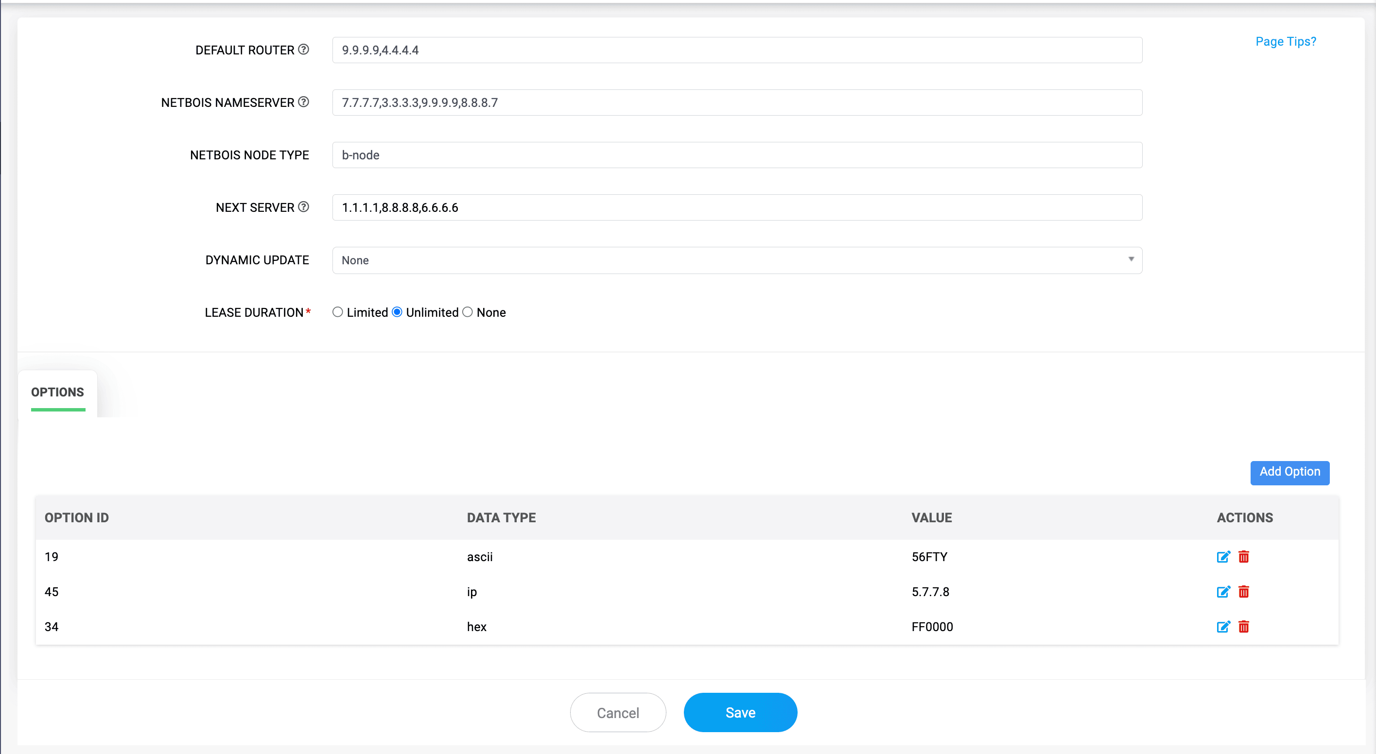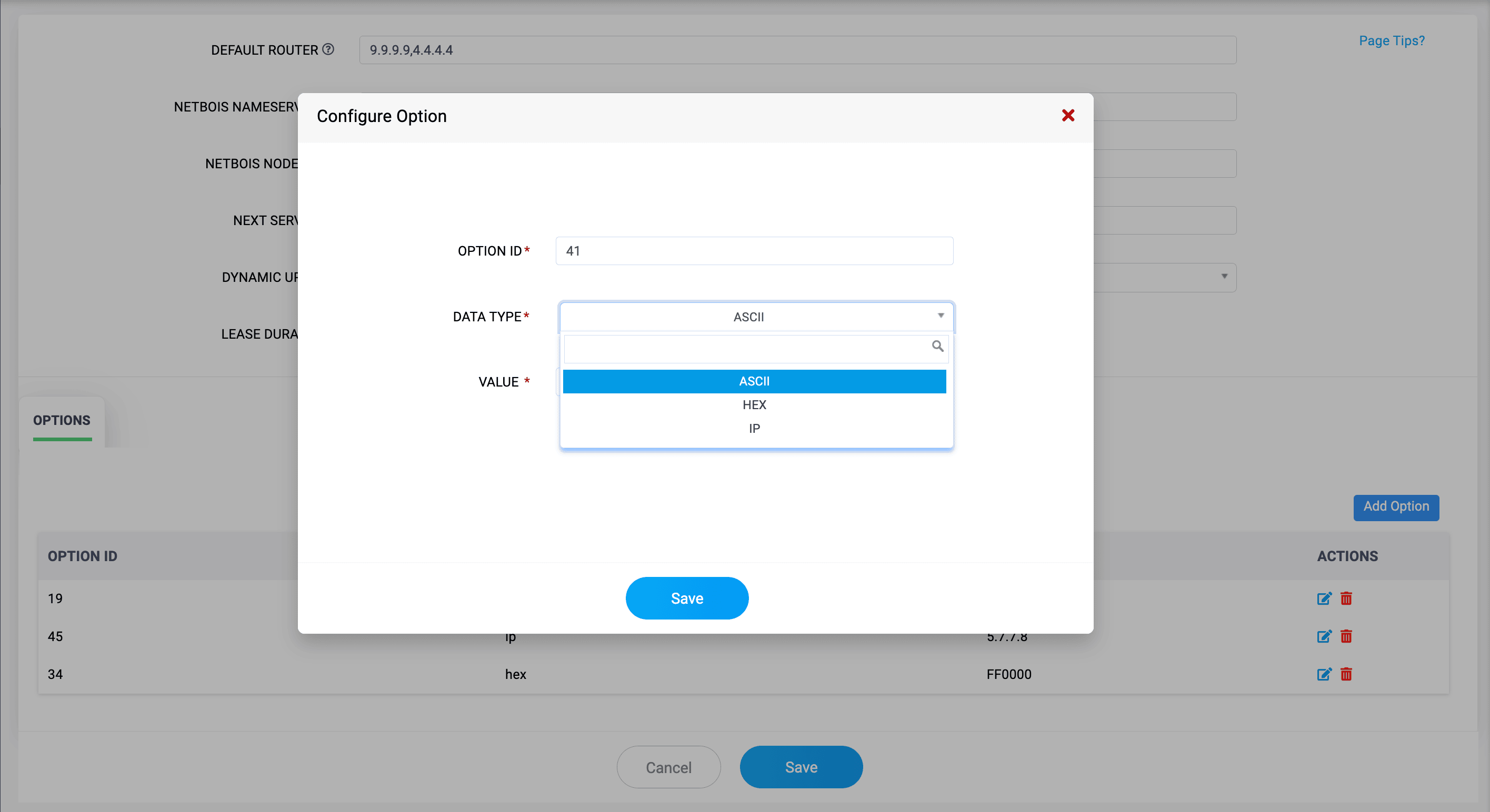 • ID (IP Address): Used when the value must be an IP address. Ideal for options that reference external servers or services, such as DNS, NTP, or TFTP servers.