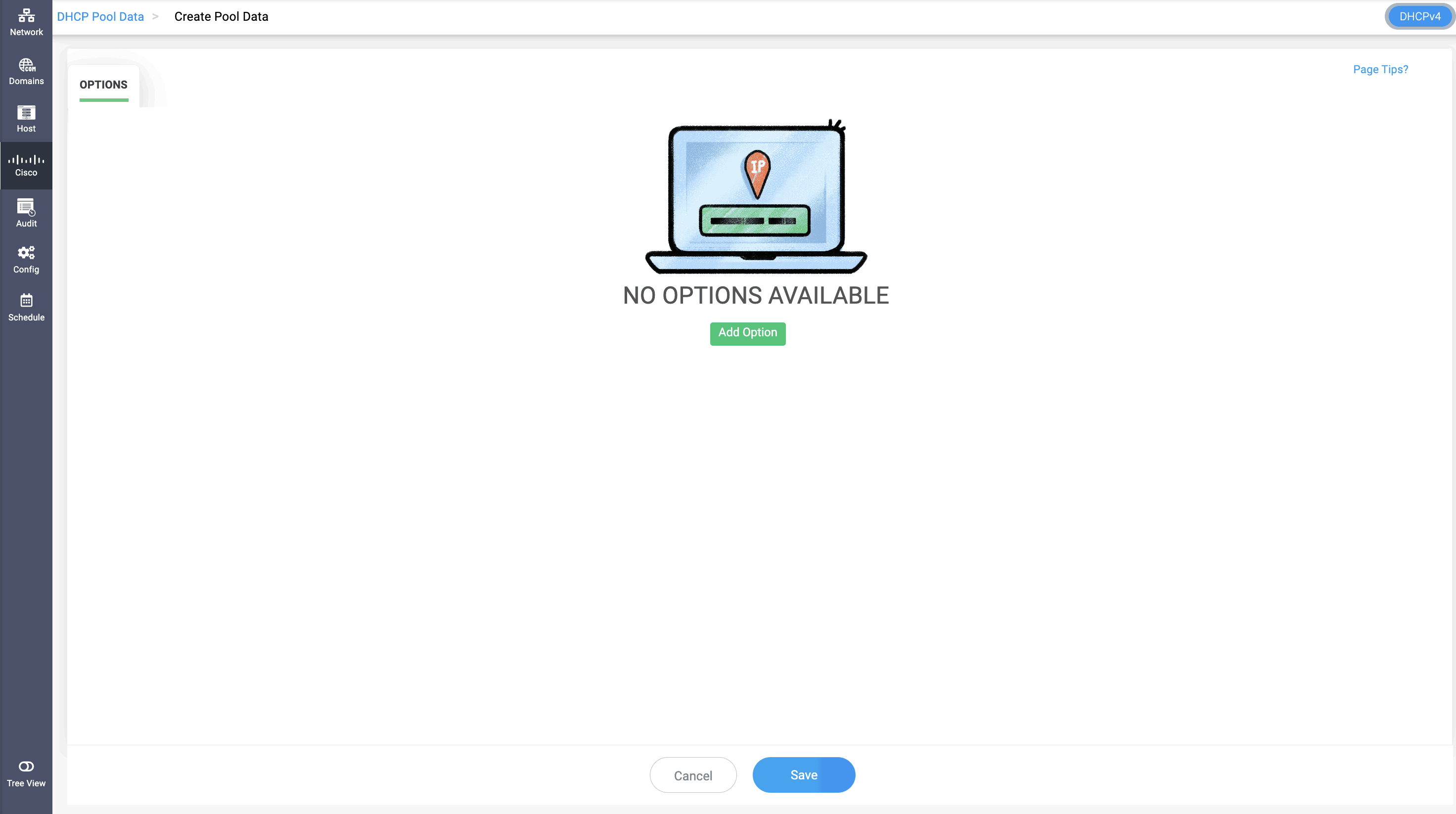 Under the DHCP section, you can view the Cisco section in the right side menu. Clicking on it showcases the subsection for DHCP pool data.