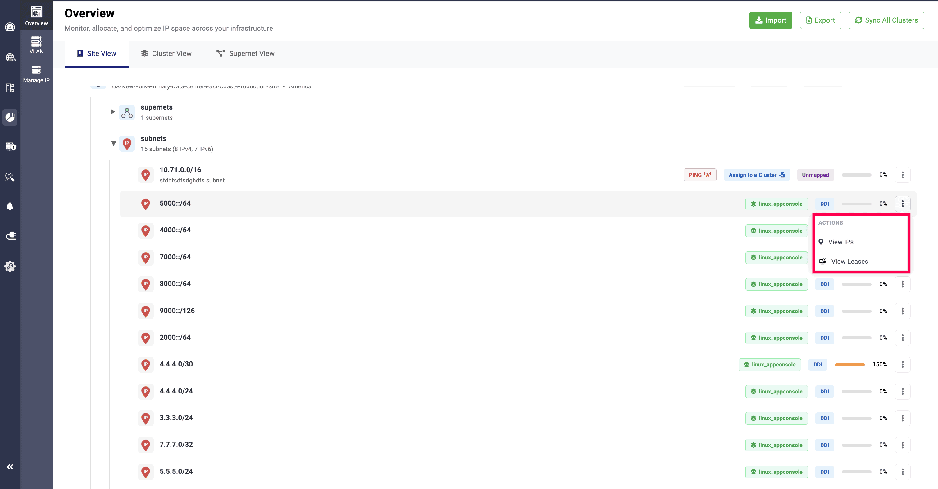 For DDI Managed subnets, you can click on the View IPs option to view all the IP addresses in the subnet, and View Leases option to view the subnet's leases and lease history.