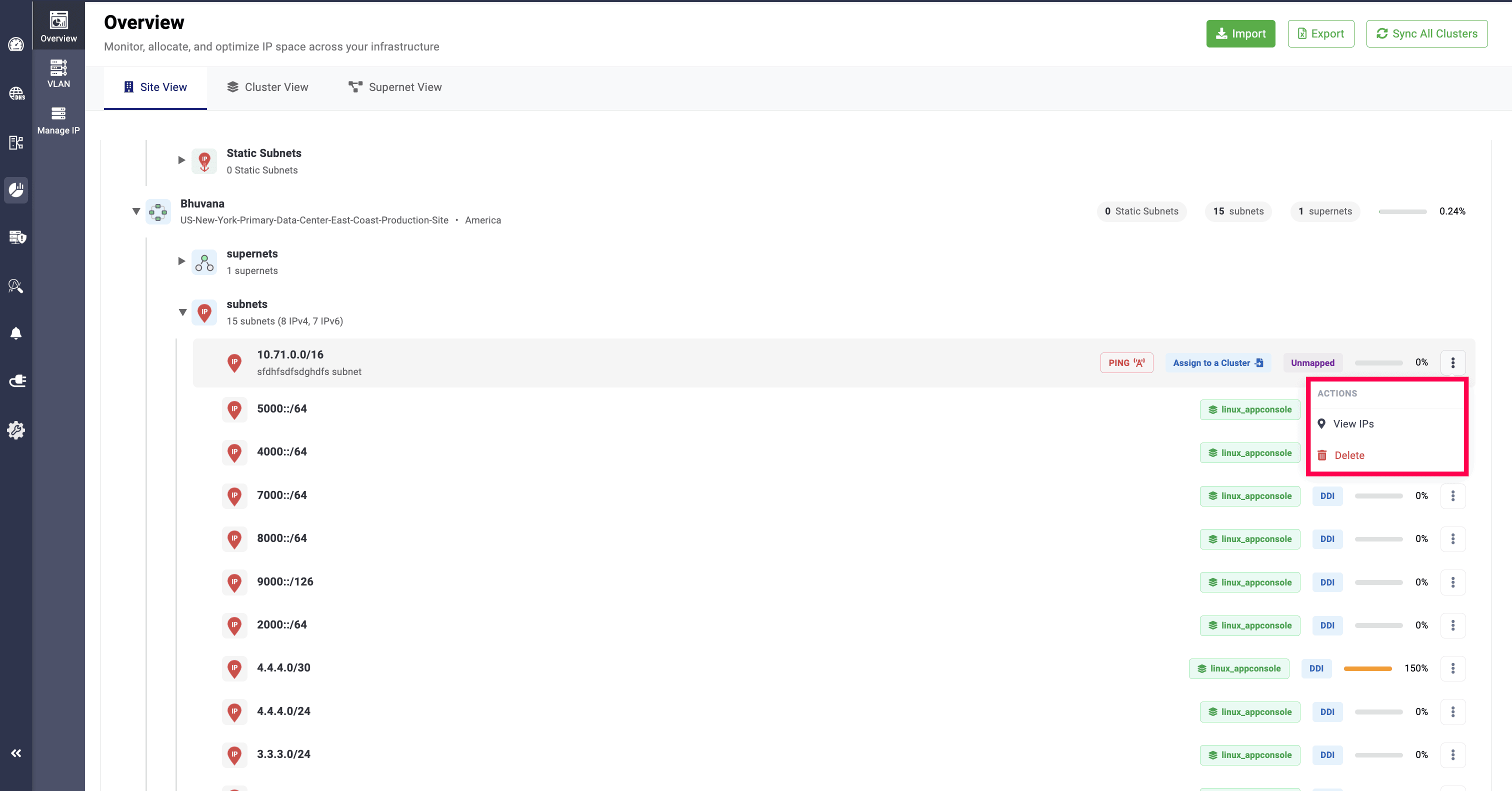 But, for Unmapped subnets, you can only view the IP addresses in the subnet through View IPs option, and you can only delete them through the Delete option.