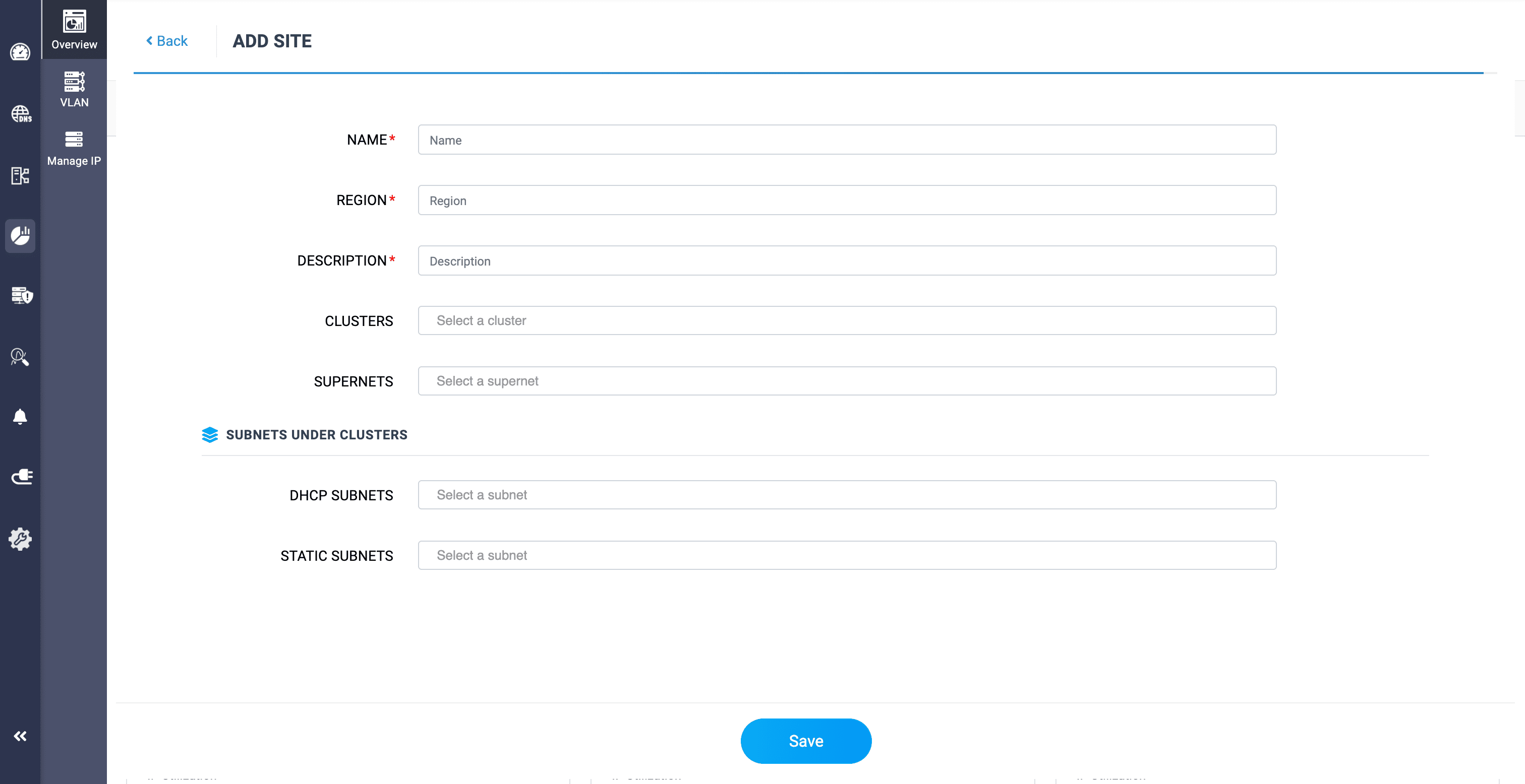 In the Add Site section, you must provide details such as the site name, the region to associate the site with, a description, and the clusters and supernets to be linked.