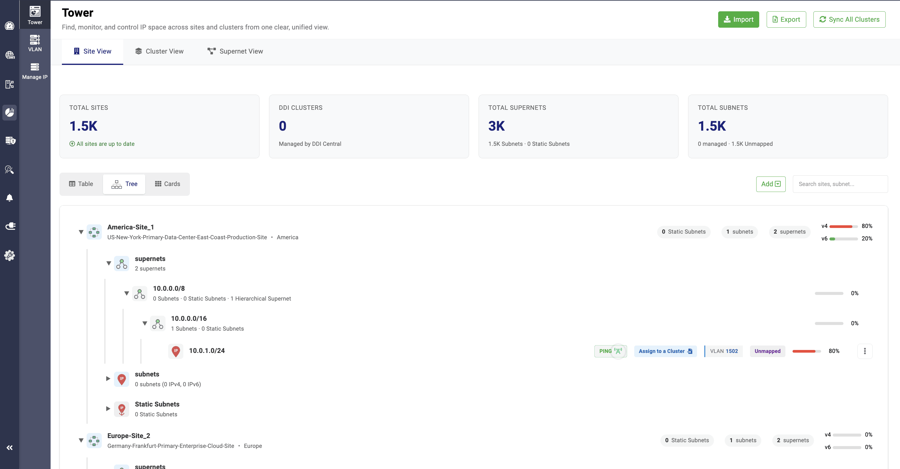 In addition, the total number of static subnets within each site is displayed, and IP utilization is shown as a percentage.
