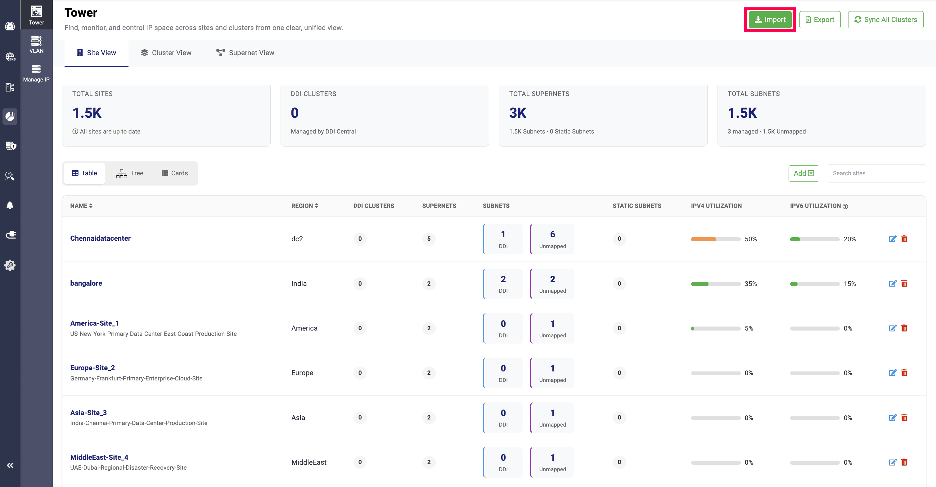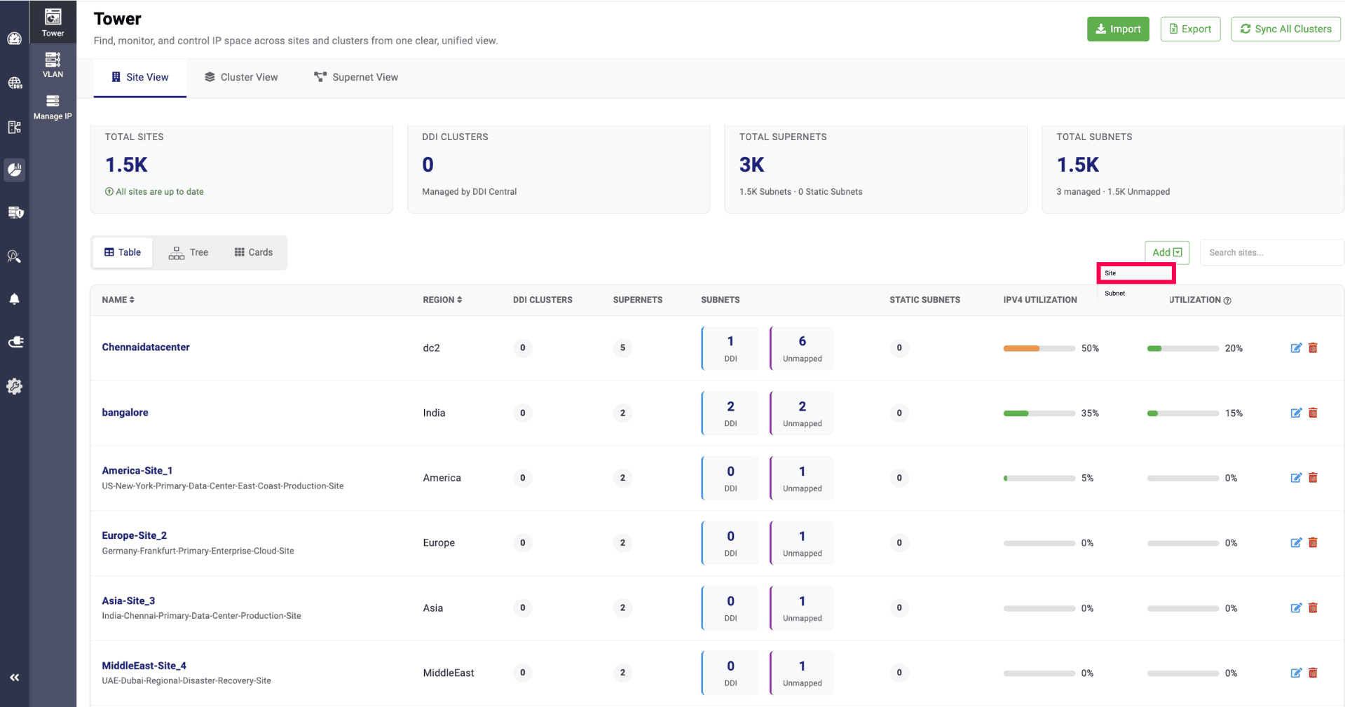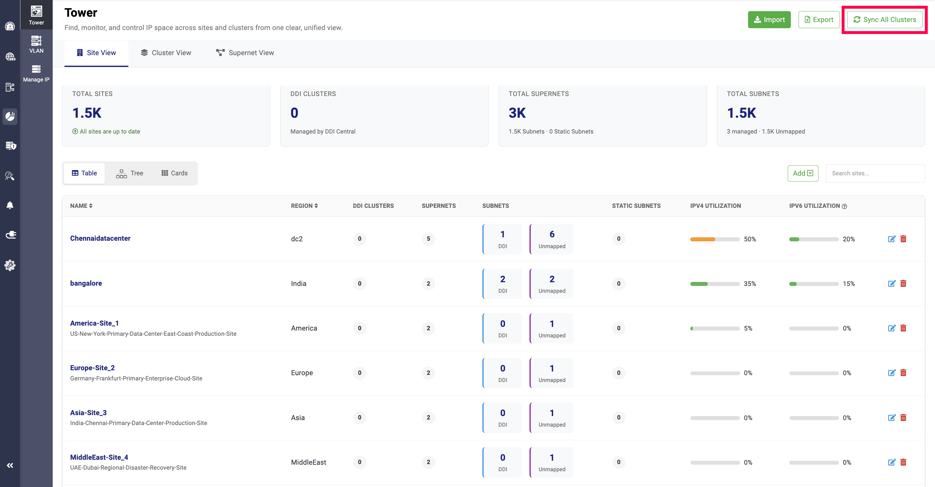 In the Table view, all sites are displayed along with their names, associated regions, total clusters managed by DDI Central, and total supernets. Subnets that are created and associated with sites are displayed as DDI, while subnets that are imported and not associated with any clusters are displayed as Unmapped.