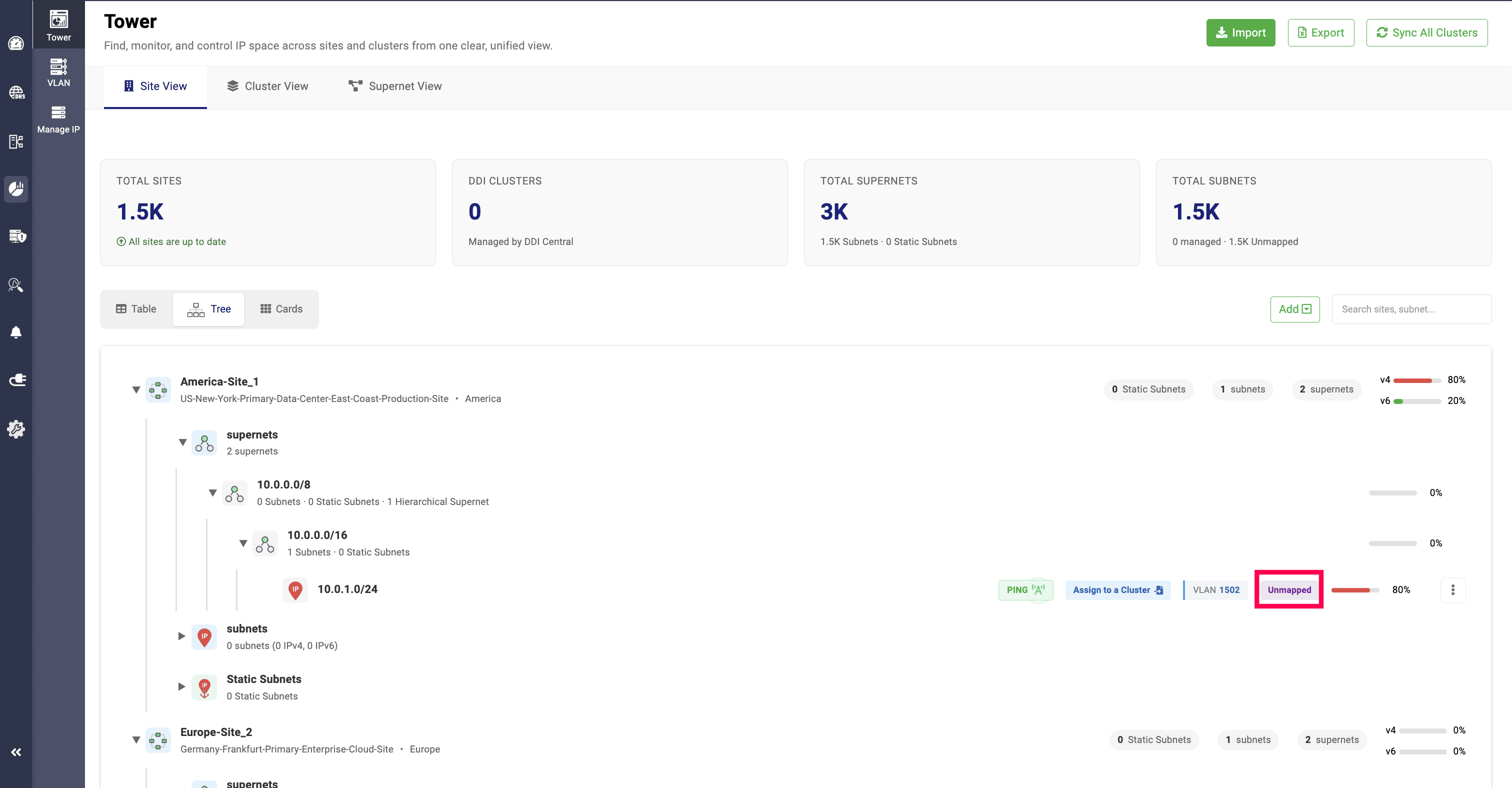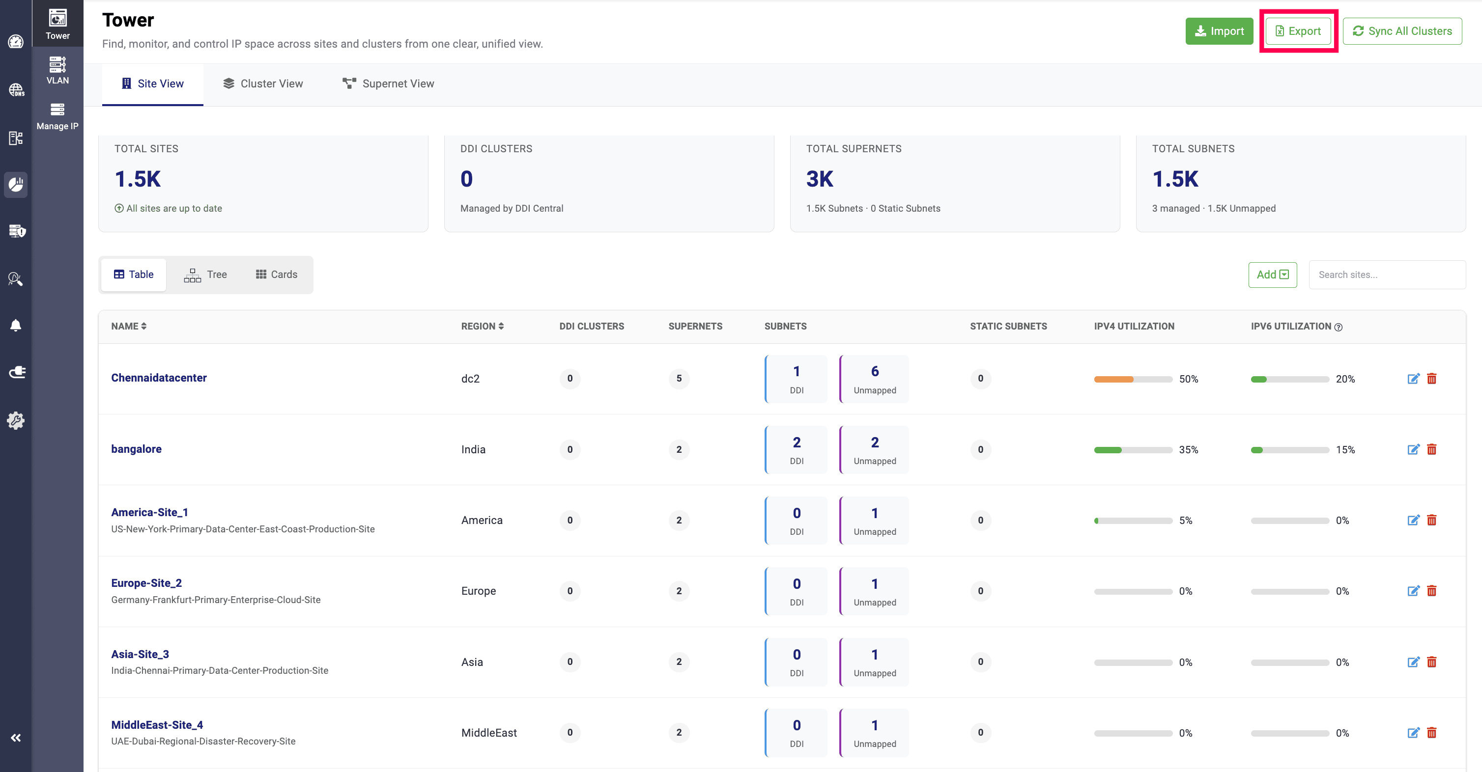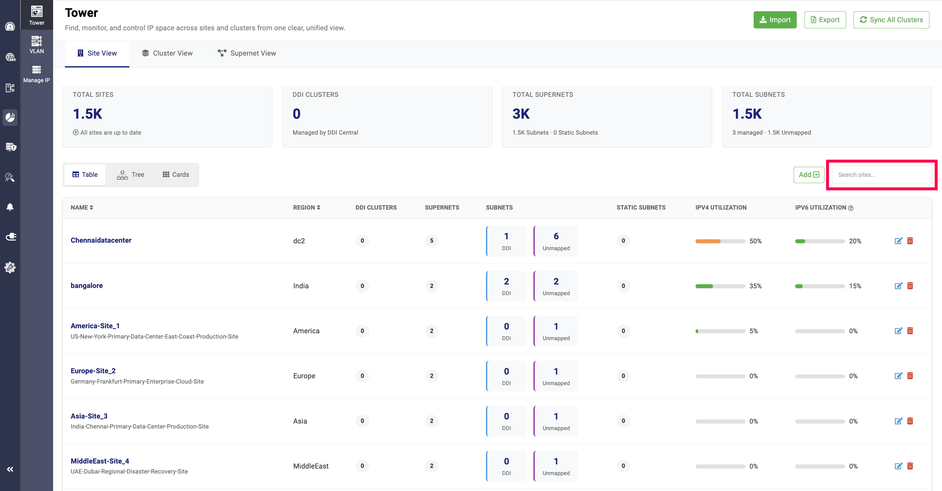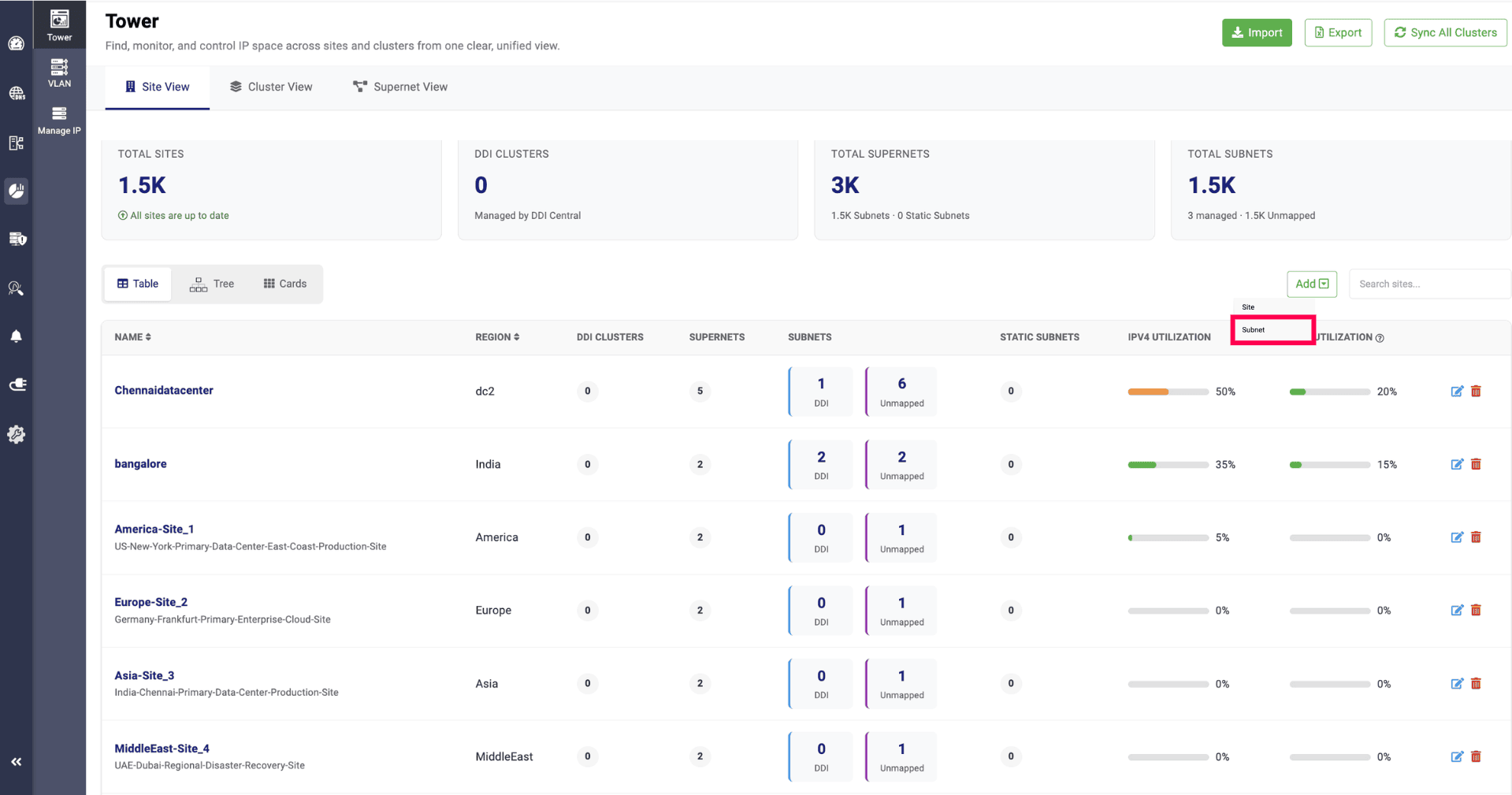 In the Table view, all sites are displayed along with their names, associated regions, total clusters managed by DDI Central, and total supernets. Subnets that are created and associated with sites are displayed as DDI, while subnets that are imported and not associated with any clusters are displayed as Unmapped.