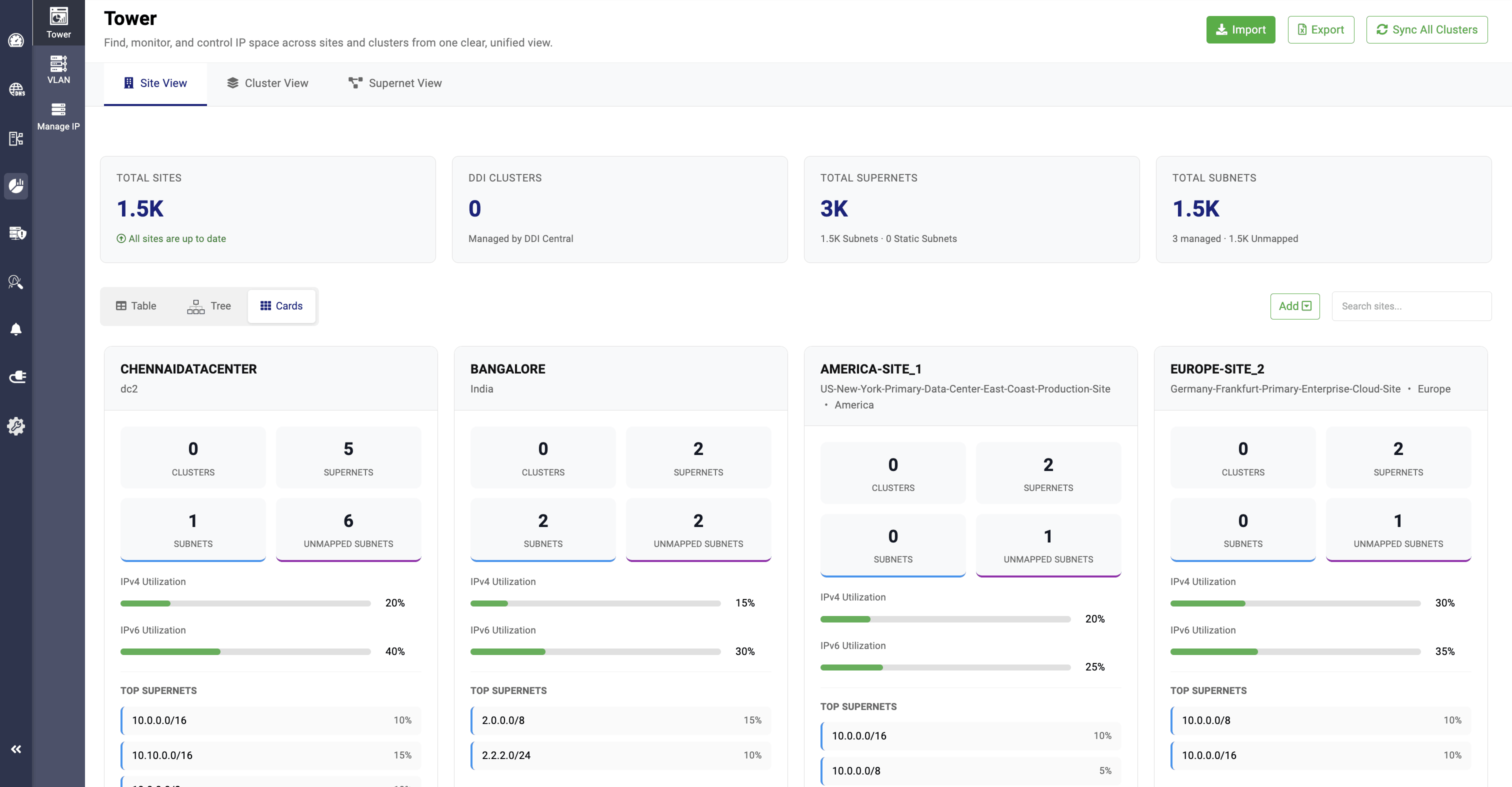 In the Cards View, network admins can see a segmented overview of the total clusters, supernets, subnets, and static subnets, along with their IP utilization and the supernet values with their respective usage.