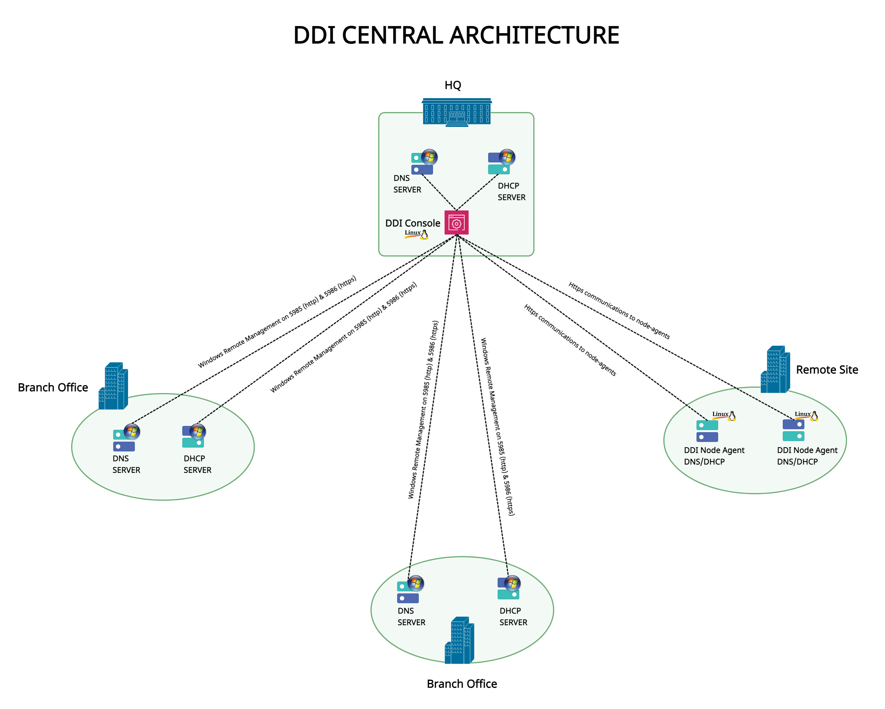 This robust network connectivity enables DDI Central to effectively manage both internal and remote site DNS-DHCP server clusters.