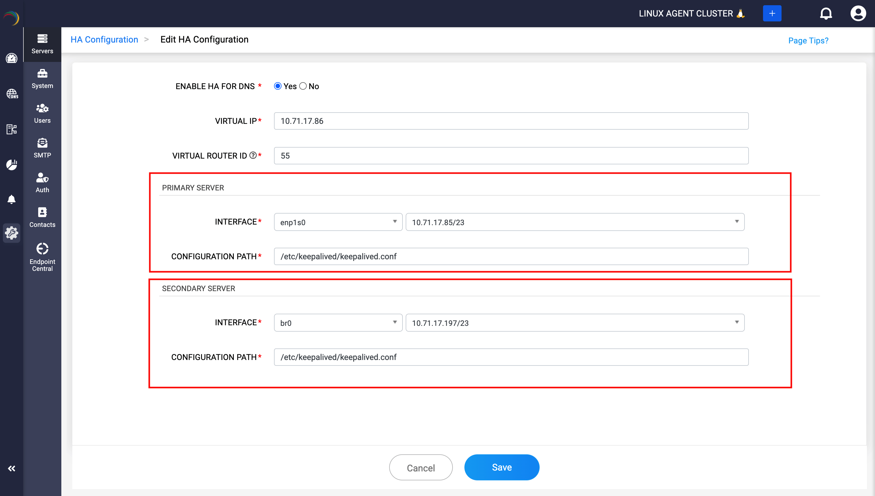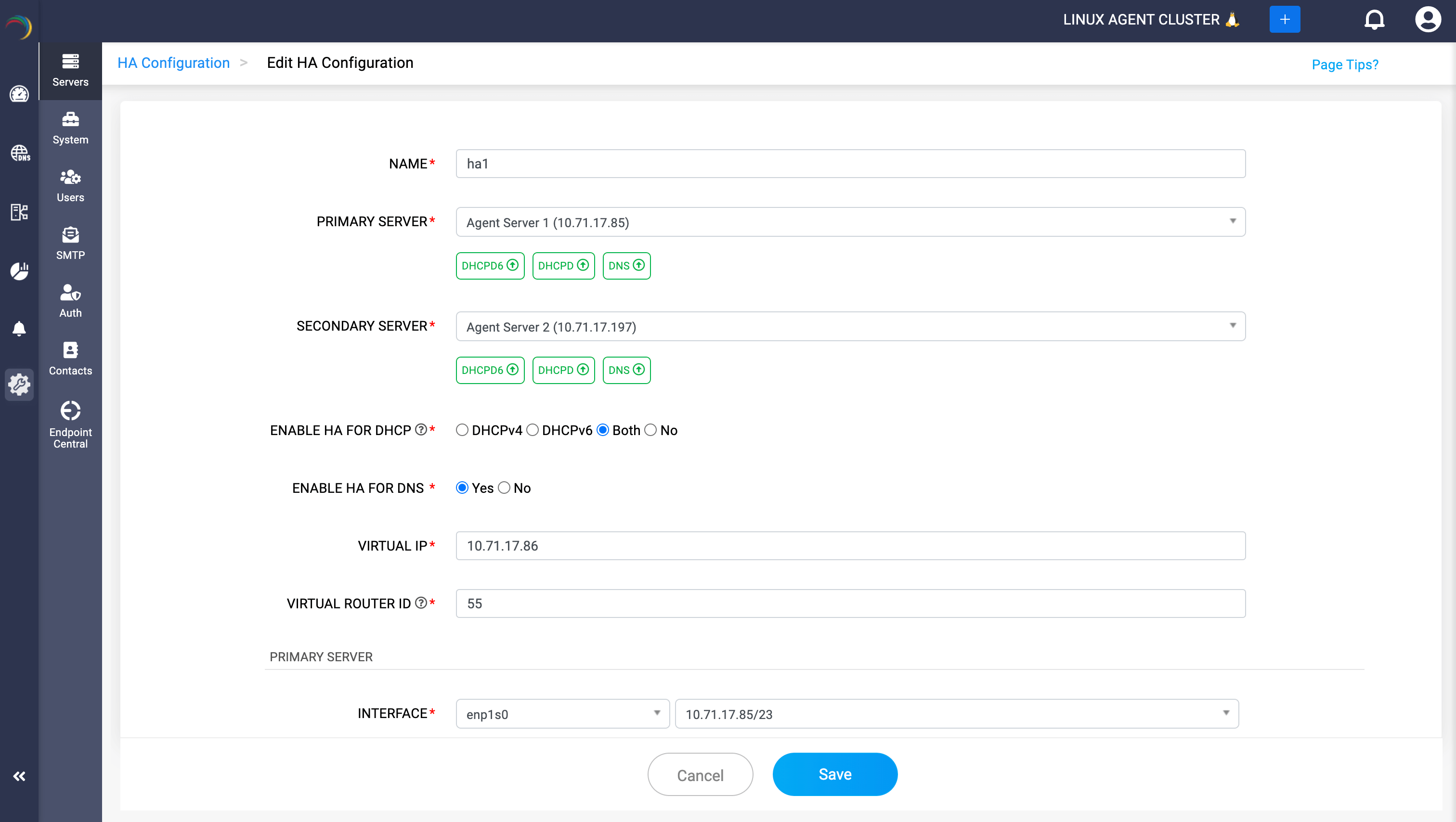 DDI Central offers High Availability (HA) support for Linux-based DNS and DHCP services deployed on Linux environments. This configuration ensures service continuity and minimal downtime in case of server failure. Microsoft DNS/DHCP and Windows-based servers are not supported for HA configuration.