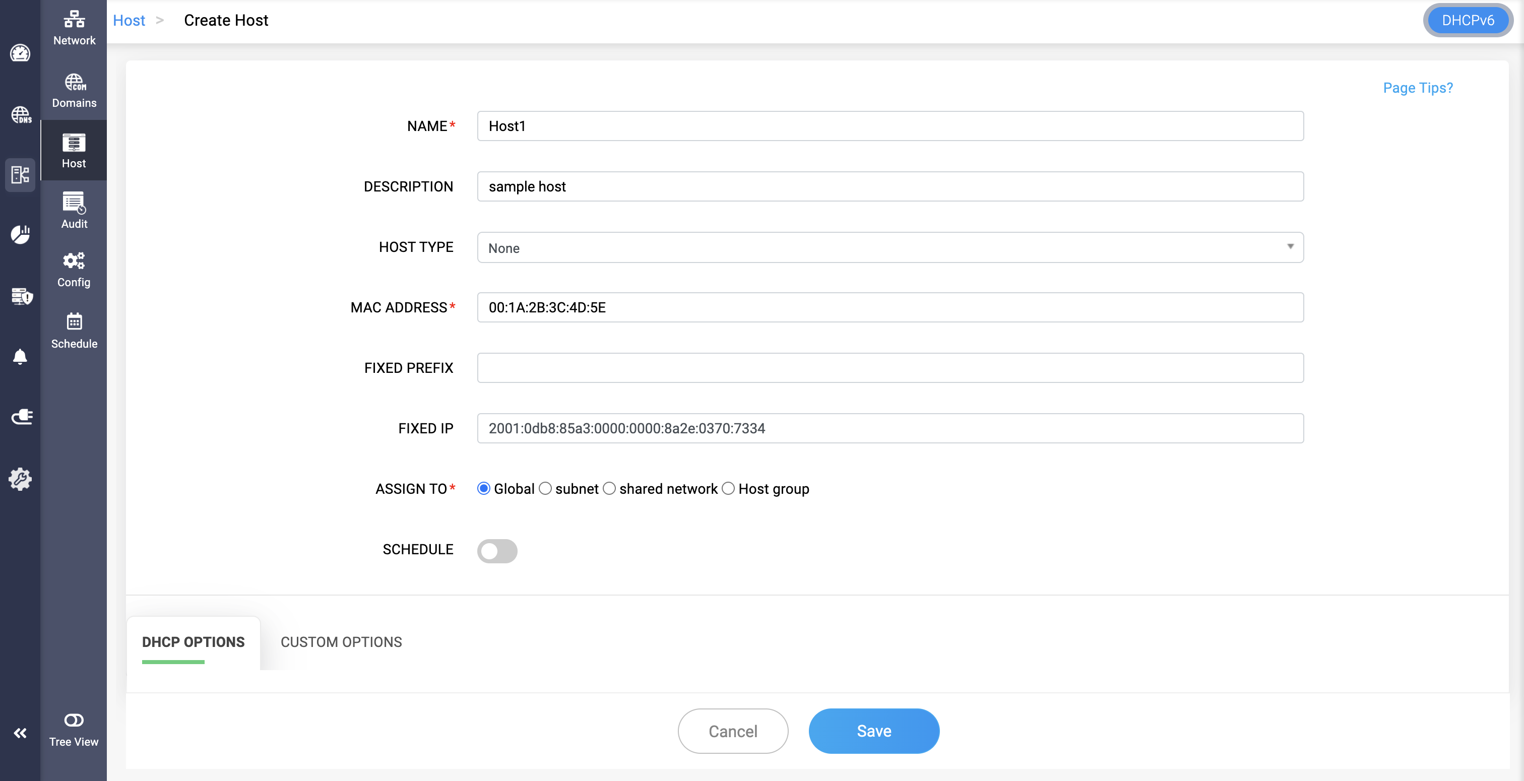 MAC ADDRESS*: Enter the MAC address of the device for which Fixed IP address is to be assigned. Required only for the relevant host types where the selected host uses MAC address. The Field may vary depending upon the host type selected.FIXED PREFIX: Enter the IPv6 network prefix that should be assigned to this host (e.g., 2001:db8:abcd::/64). Useful for DHCPv6 prefix delegation scenarios.FIXED IP: Specify the fixed IPv6 address you want this host to receive.ASSIGN TO*: Define the scope or context to which this reservation applies.Options include: