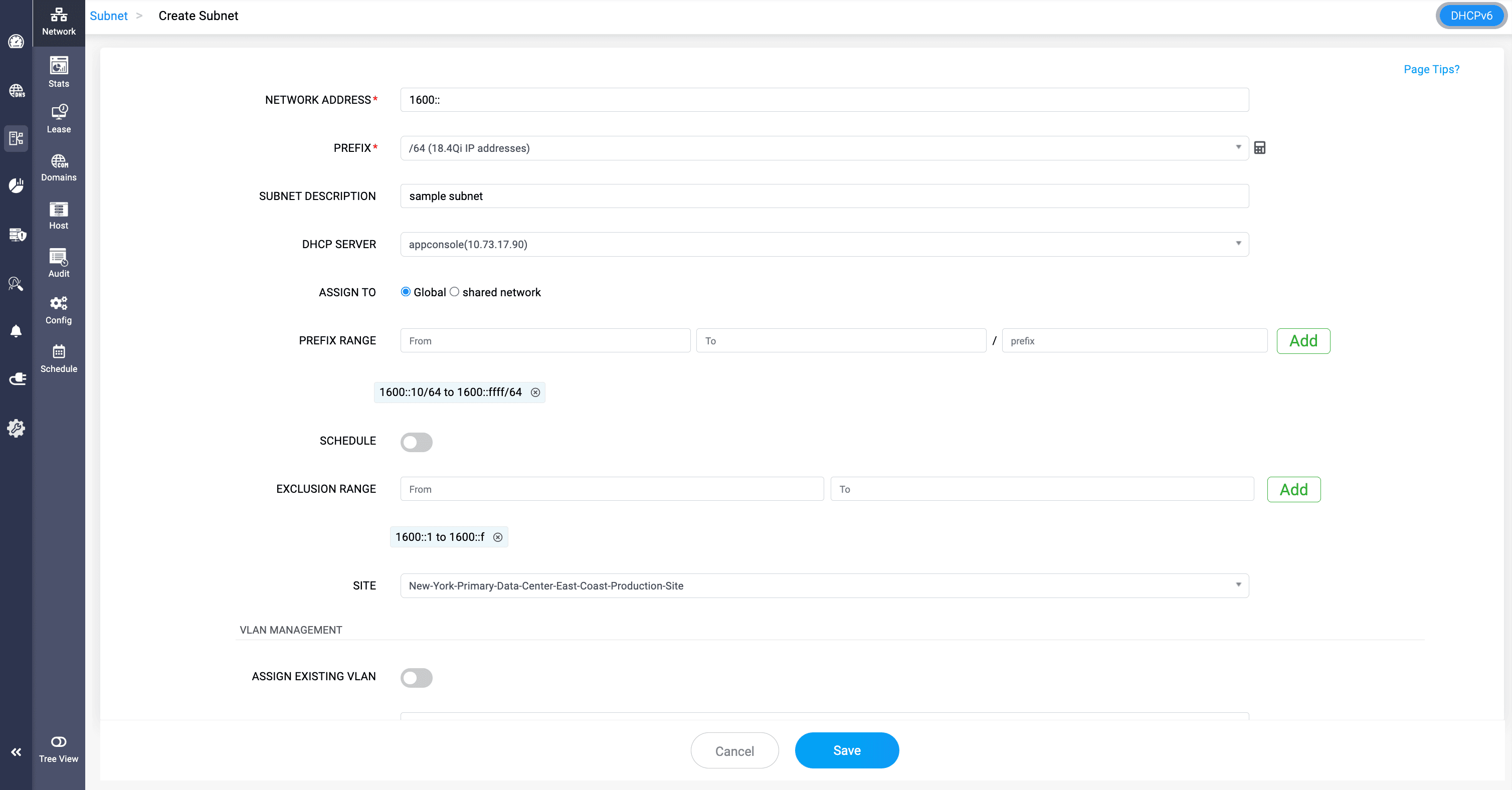 • Exclusion Range: Define a block of IPs within the subnet that should not be used for DHCP assignment. Prevents conflicts with statically assigned IPs. The field appears only if a valid Prefix range is defined for the subnet.
