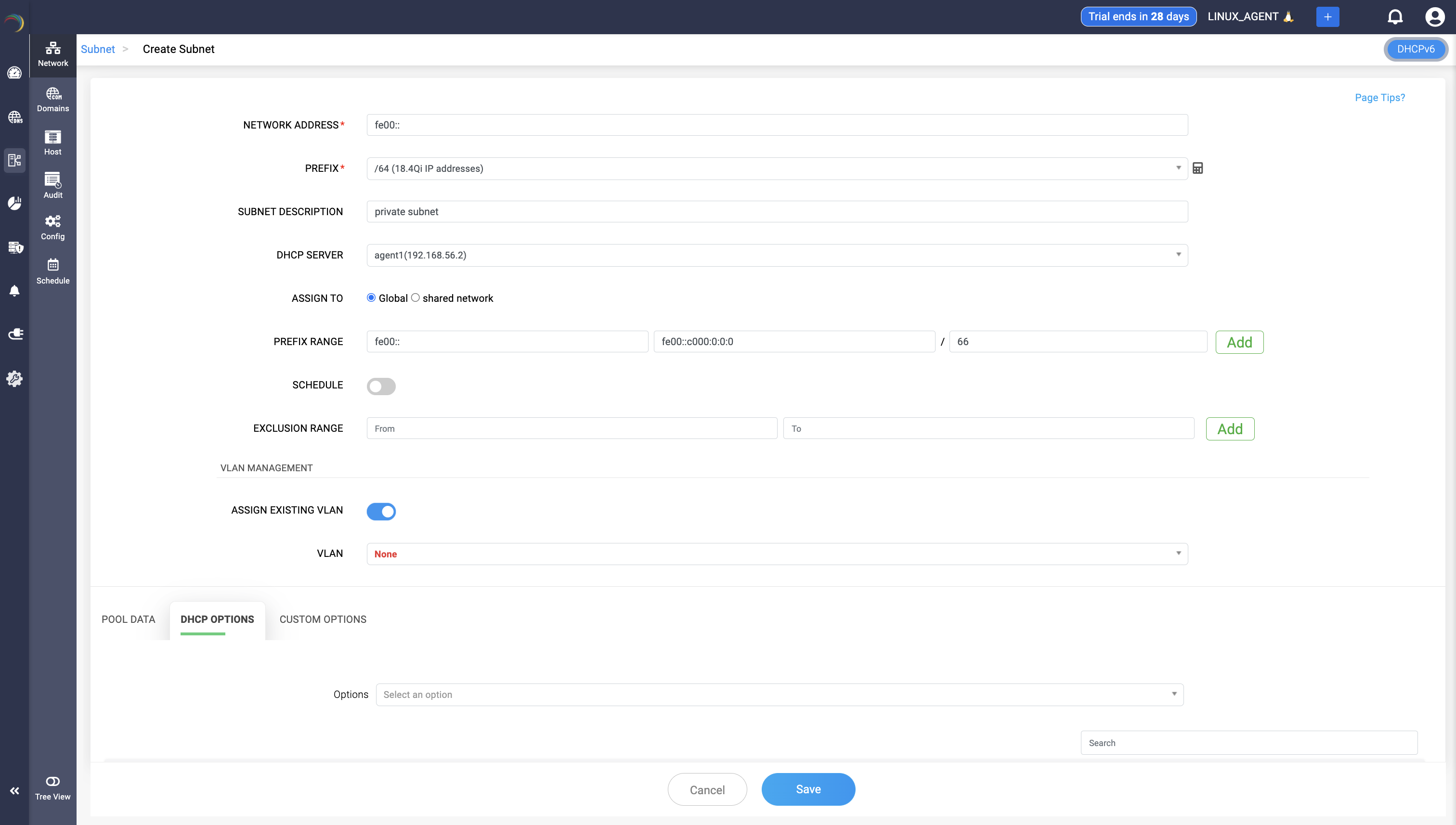 Select from a list of standard DHCPv6 options (such as DNS servers, domain search lists, preferred lifetime, etc.) to be associated with the subnet or specific pools. These options help define the behavior and network parameters for the assigned clients.